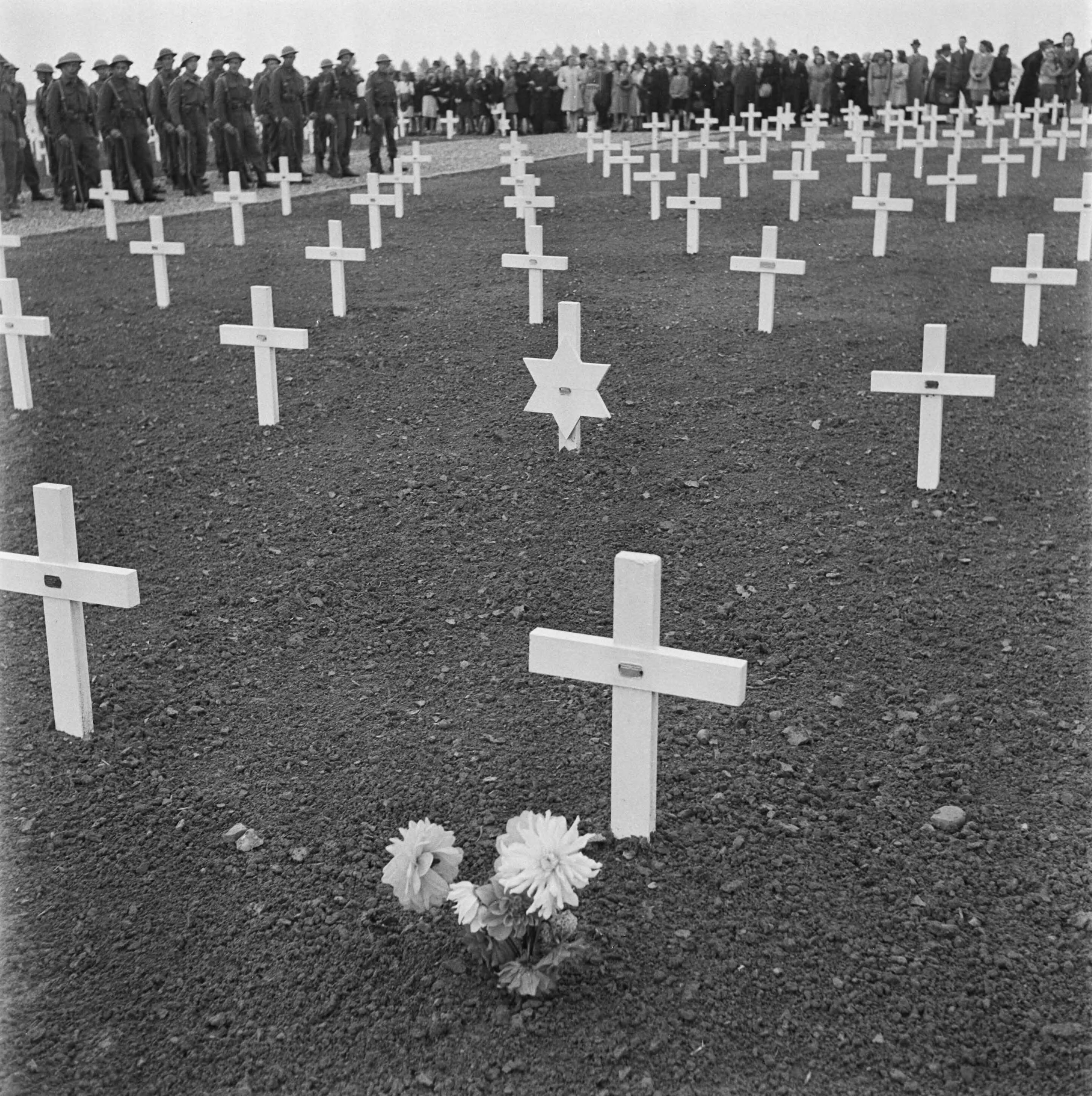 Kranslegging op het soldatenkerkhof Margraten (L.) door minister president Schermerhorn. Enkele graven