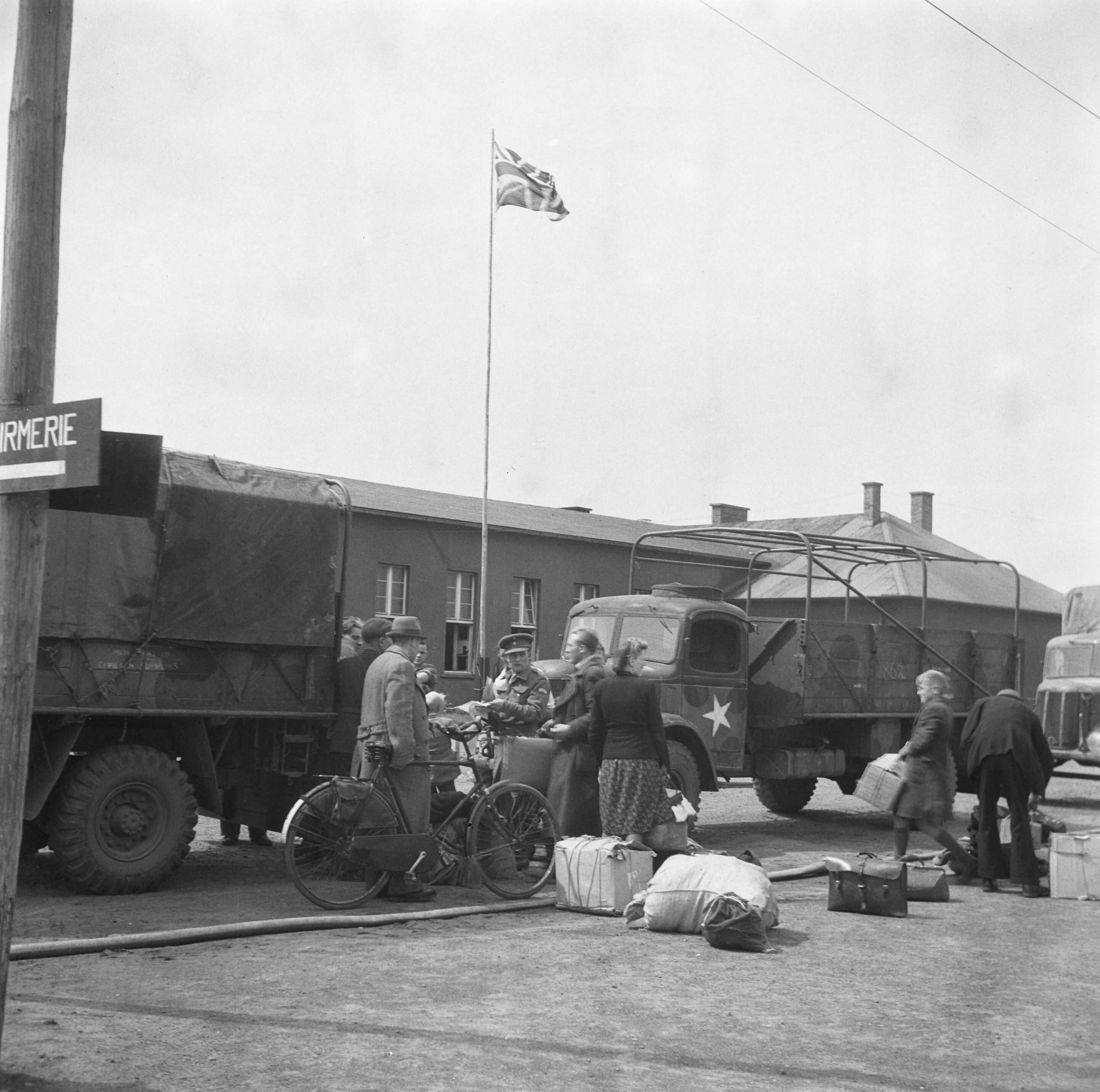 Kolonne vrachtwagens staat gereed. Bagage wordt ingeladen