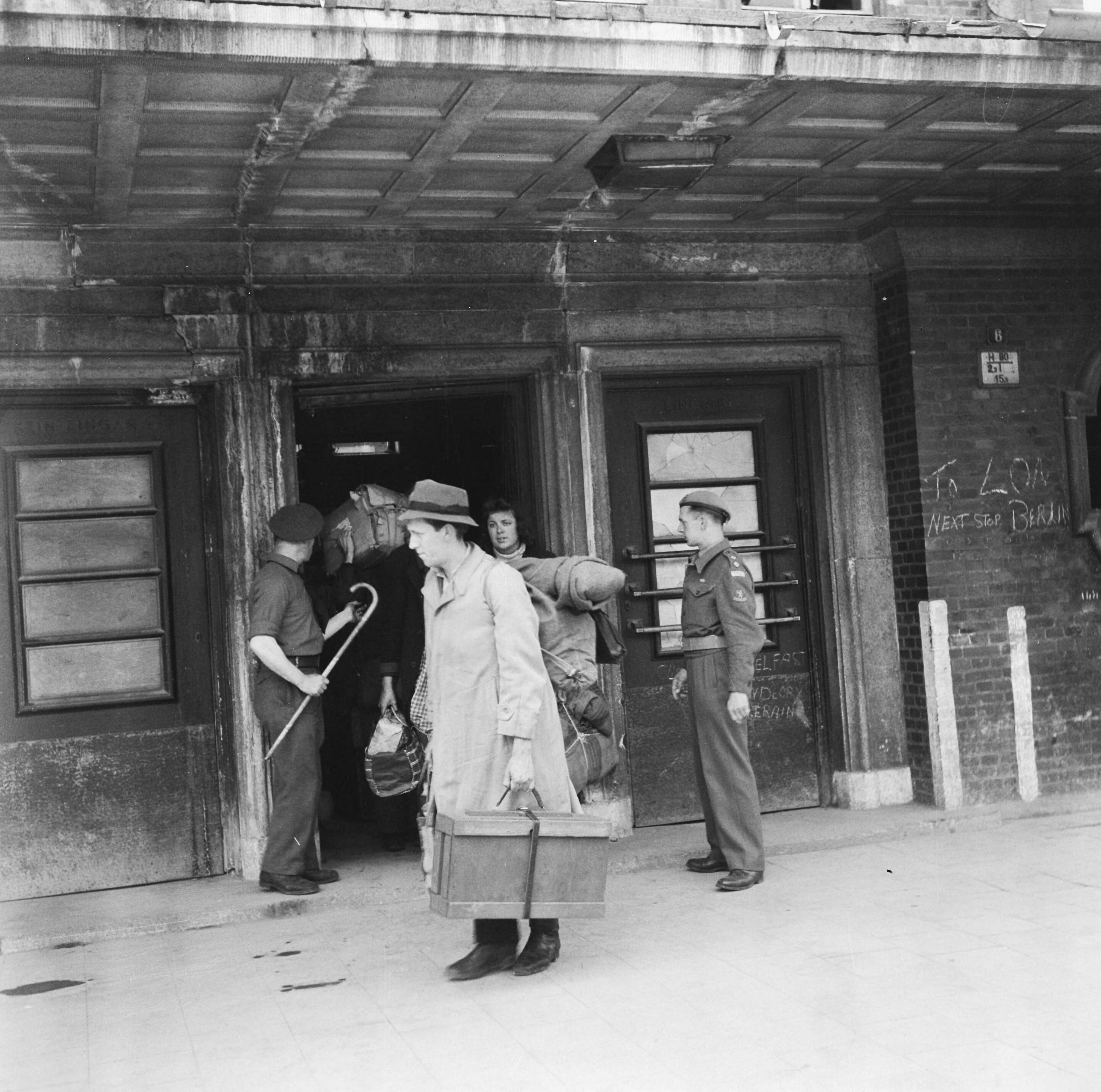 Repatrianten met bagage verlaten station
