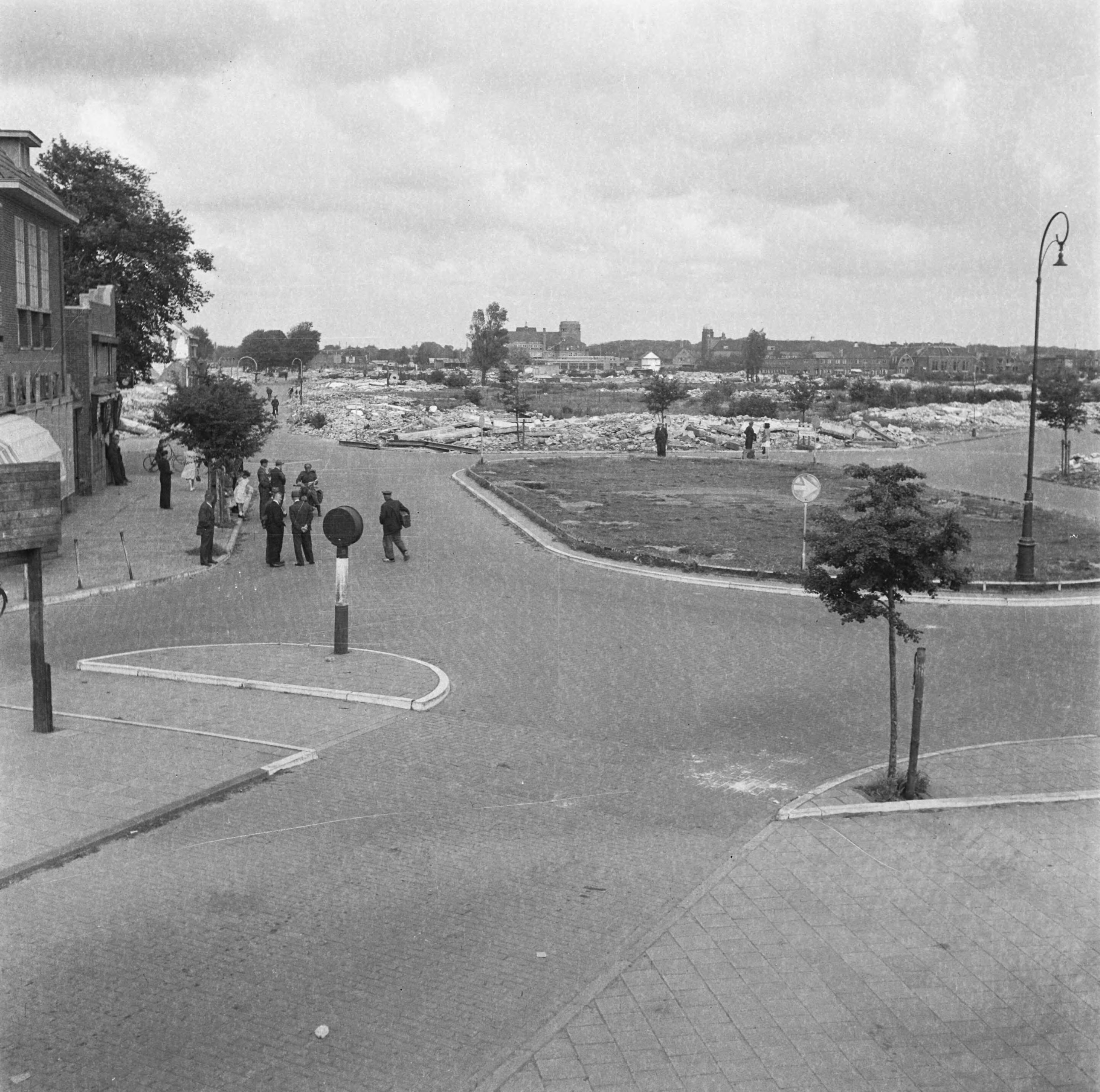 Overzicht verwoestingen. In de voorgrond een verkeersplein. Links een onbeschadigd gebouw