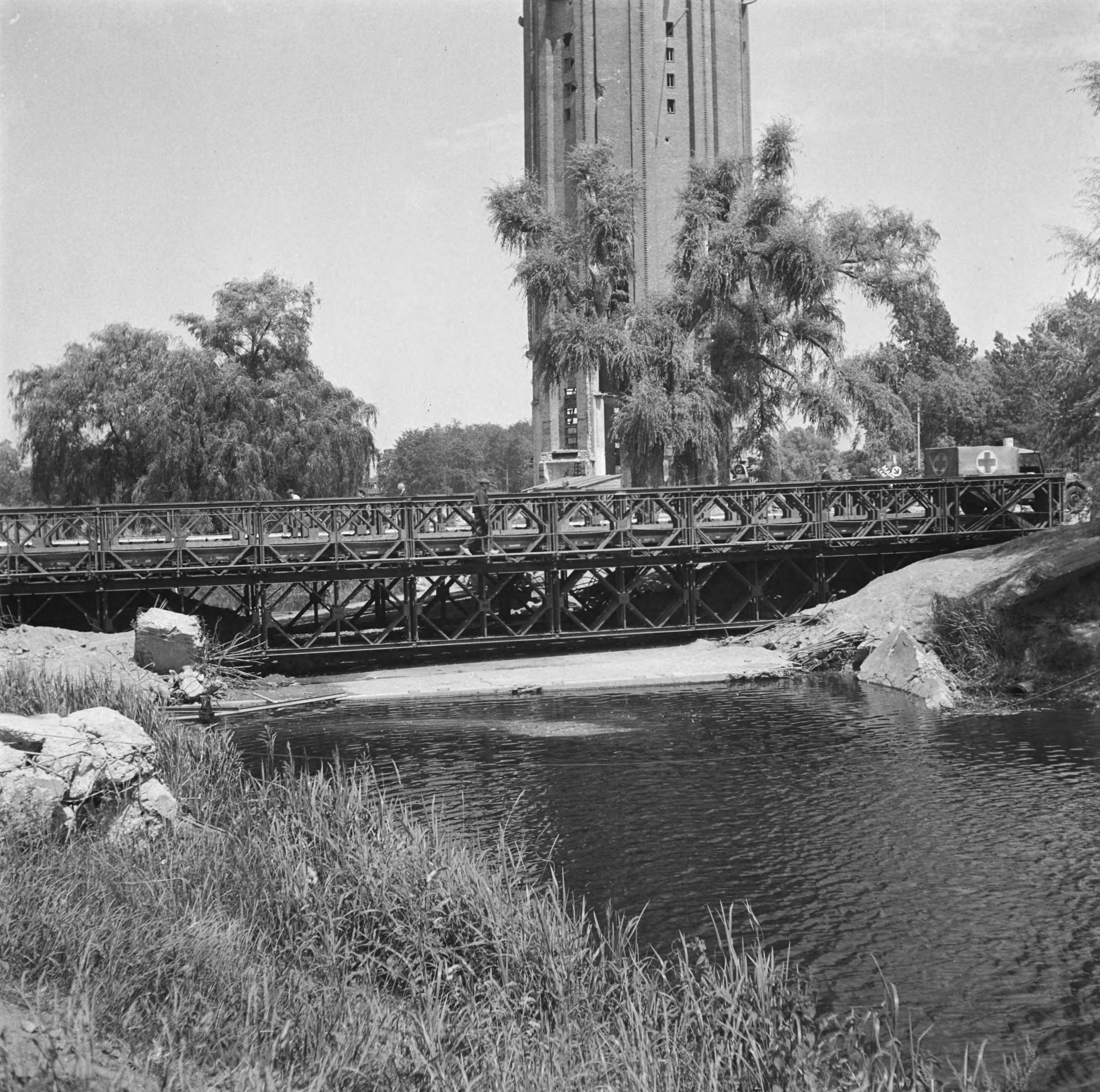 Noodbrug tussen de Warnsveldseweg en Laarstraat. Op de achtergrond staat de gehavende watertoren.