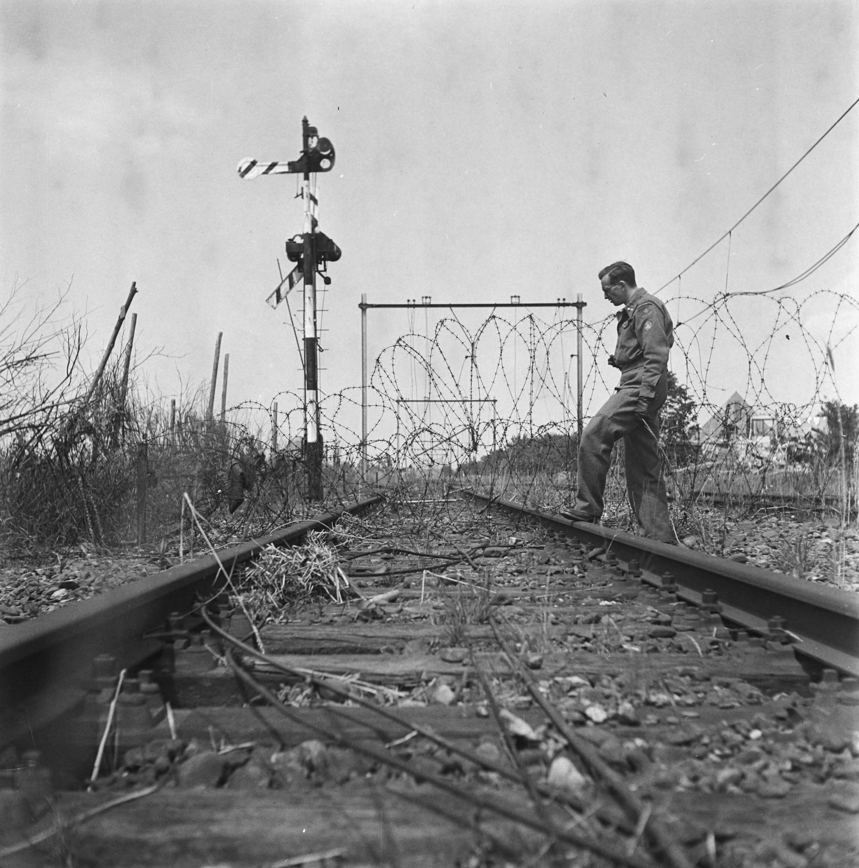 Prikkeldraadversperring over spoorbaan Arnhem-Nijmegen bij Elst. Rechts een Nederlandse luitenant