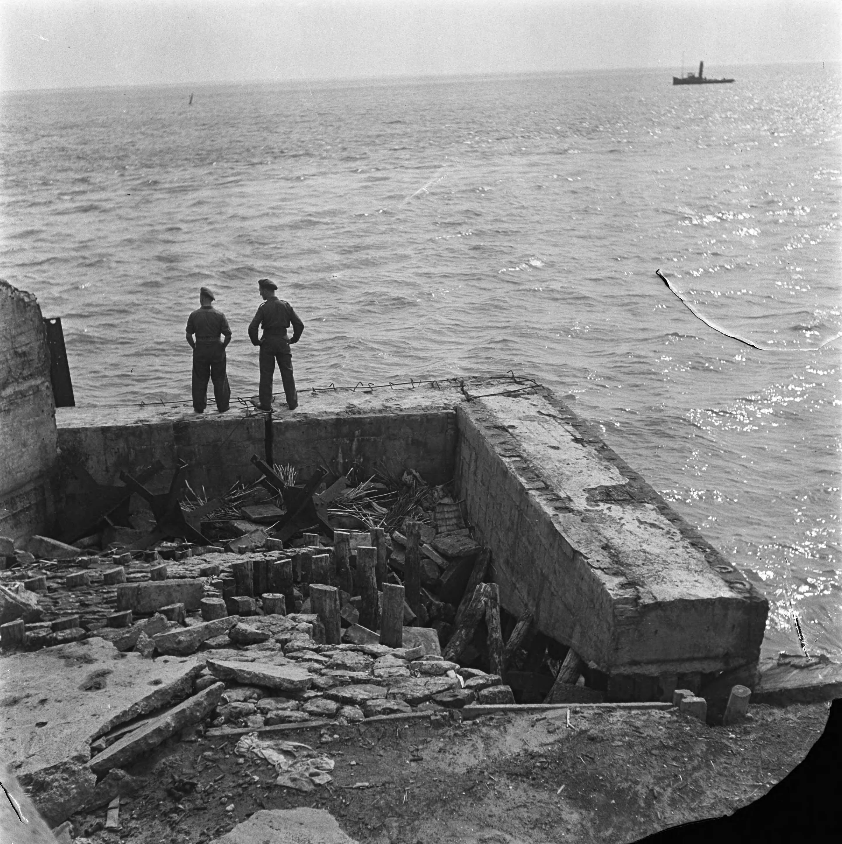 Twee militairen staan op een bouwwerk van gewapend beton