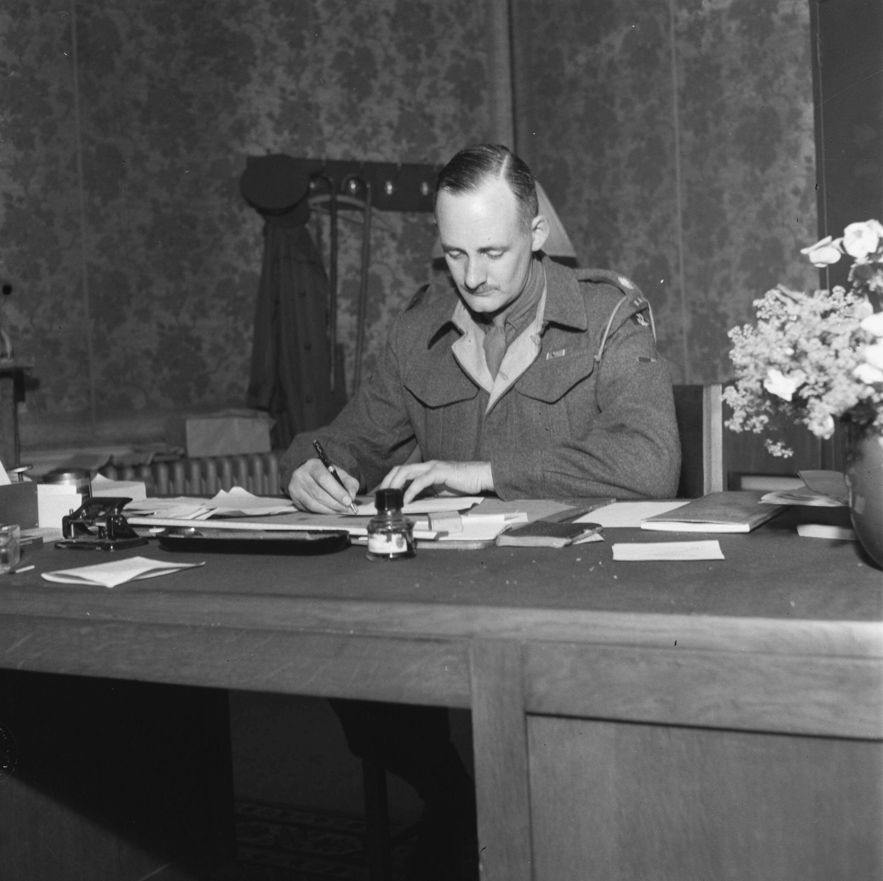 Town-Major-Office van Den Haag. Canadese stadscommandant achter een bureau