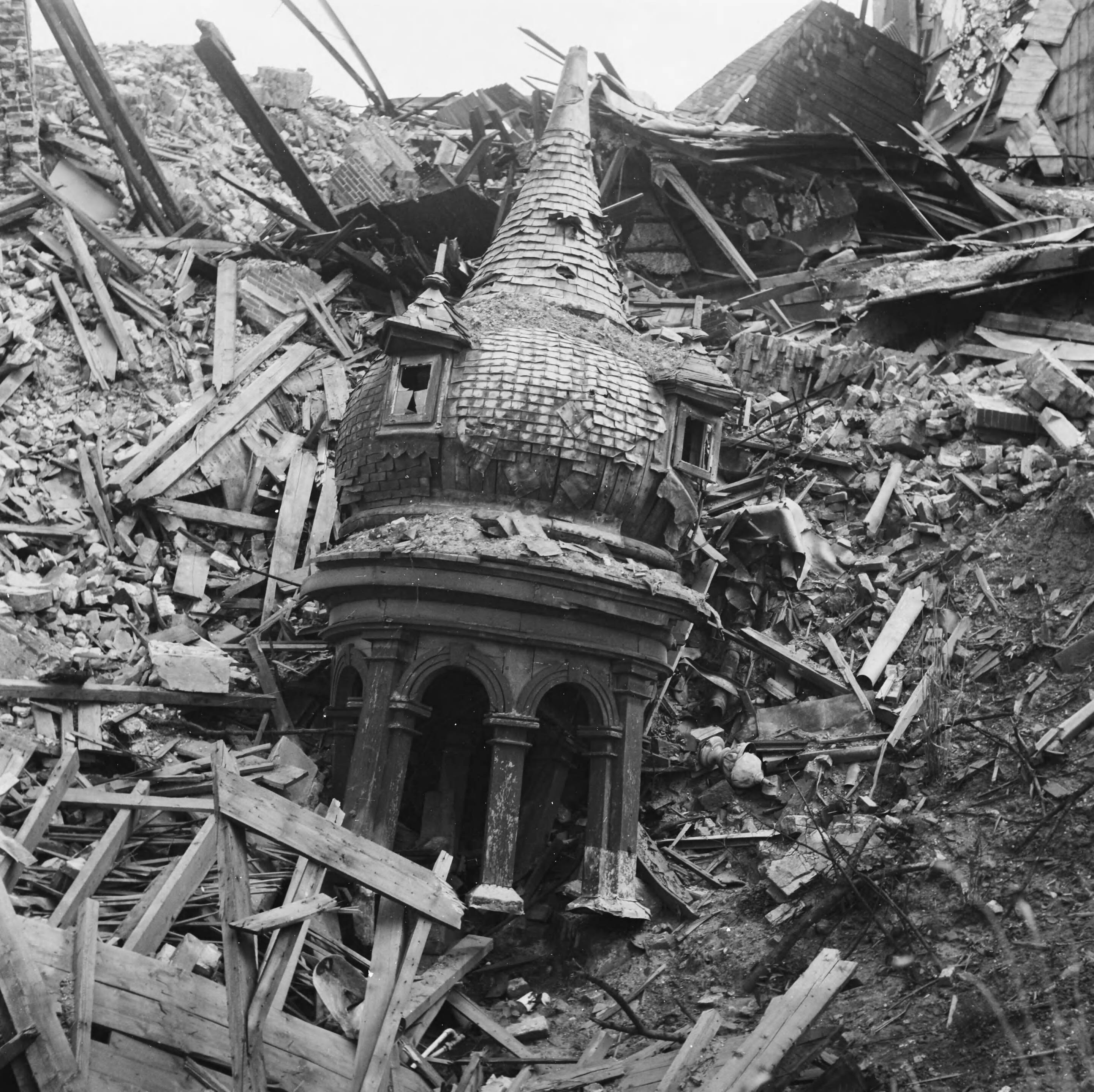 Vernielingen Venlo. Restant van een torenspitsje van het in 1944 verwoestte klooster Trans Cedron aan de Kleine Beekstraat te Venlo. Torentje bevond zich aan de zuidwesthoek van dit complex.