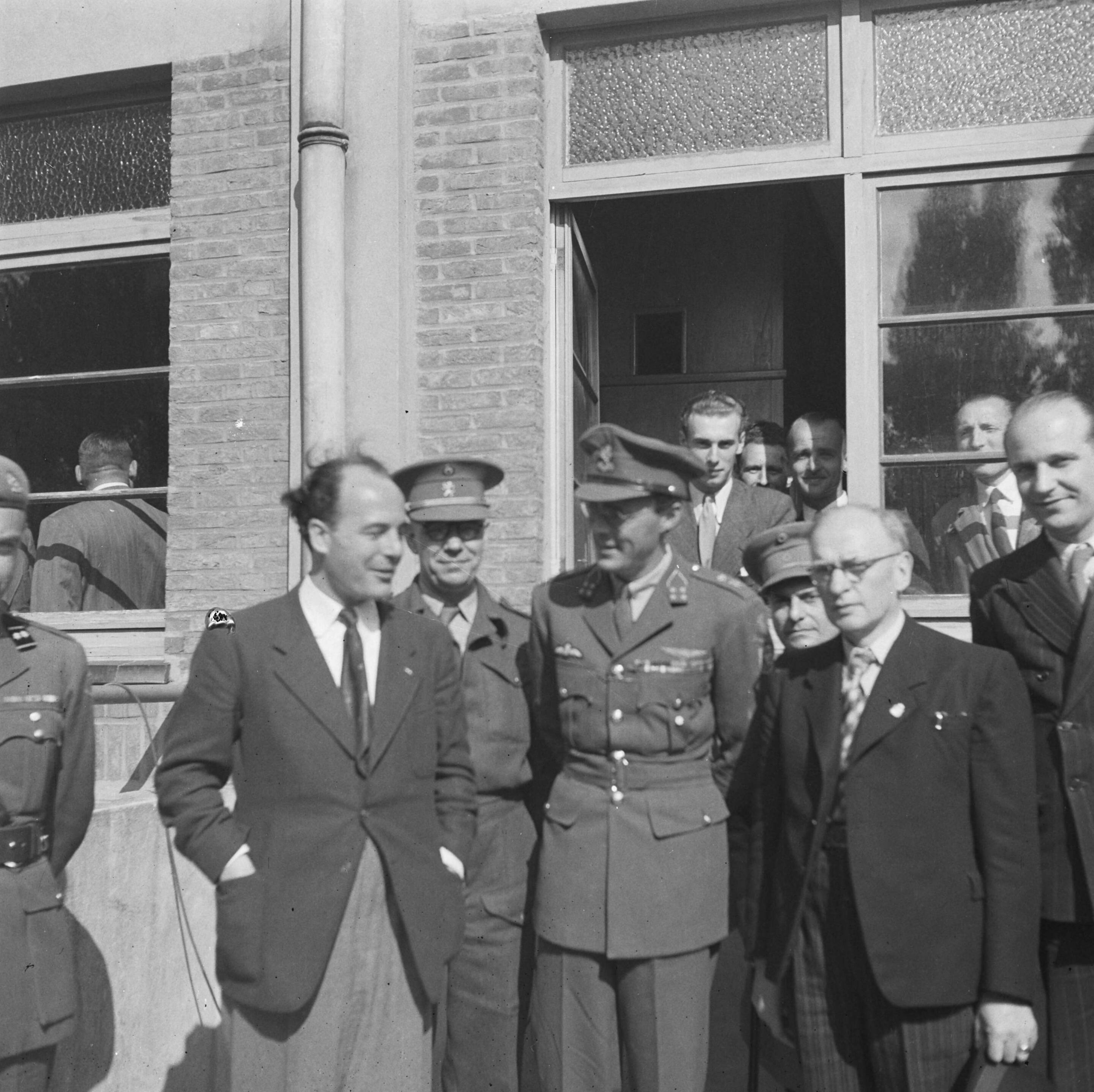 Miitairen en burgers poseren, waaronder prins Bernhard en luitenant-kolonel C.H.J.F. van Houten (links, half zichtbaar)