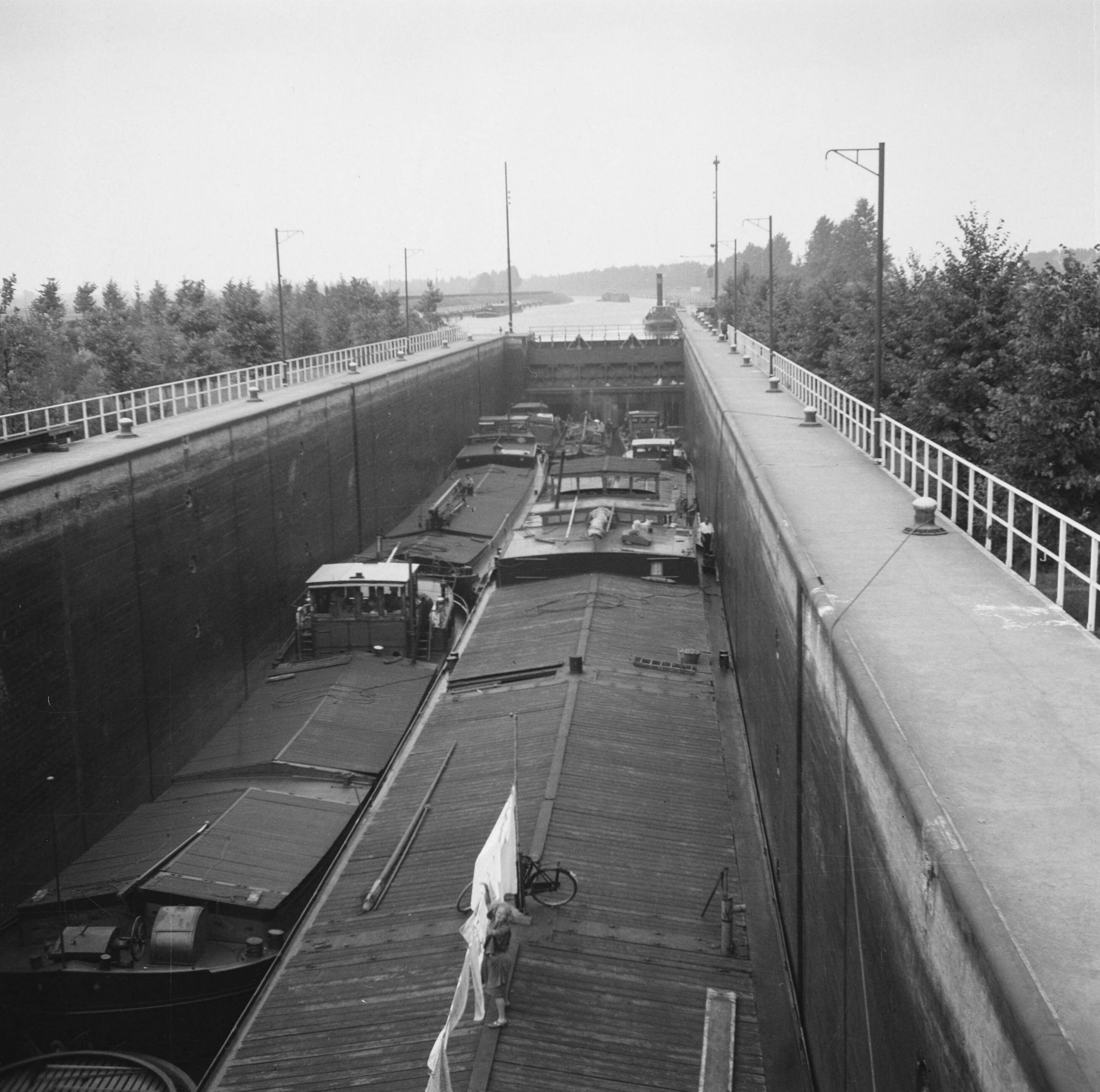 Kolensleep op de Maas. Sluis bij Maasbracht in het Julianakanaal