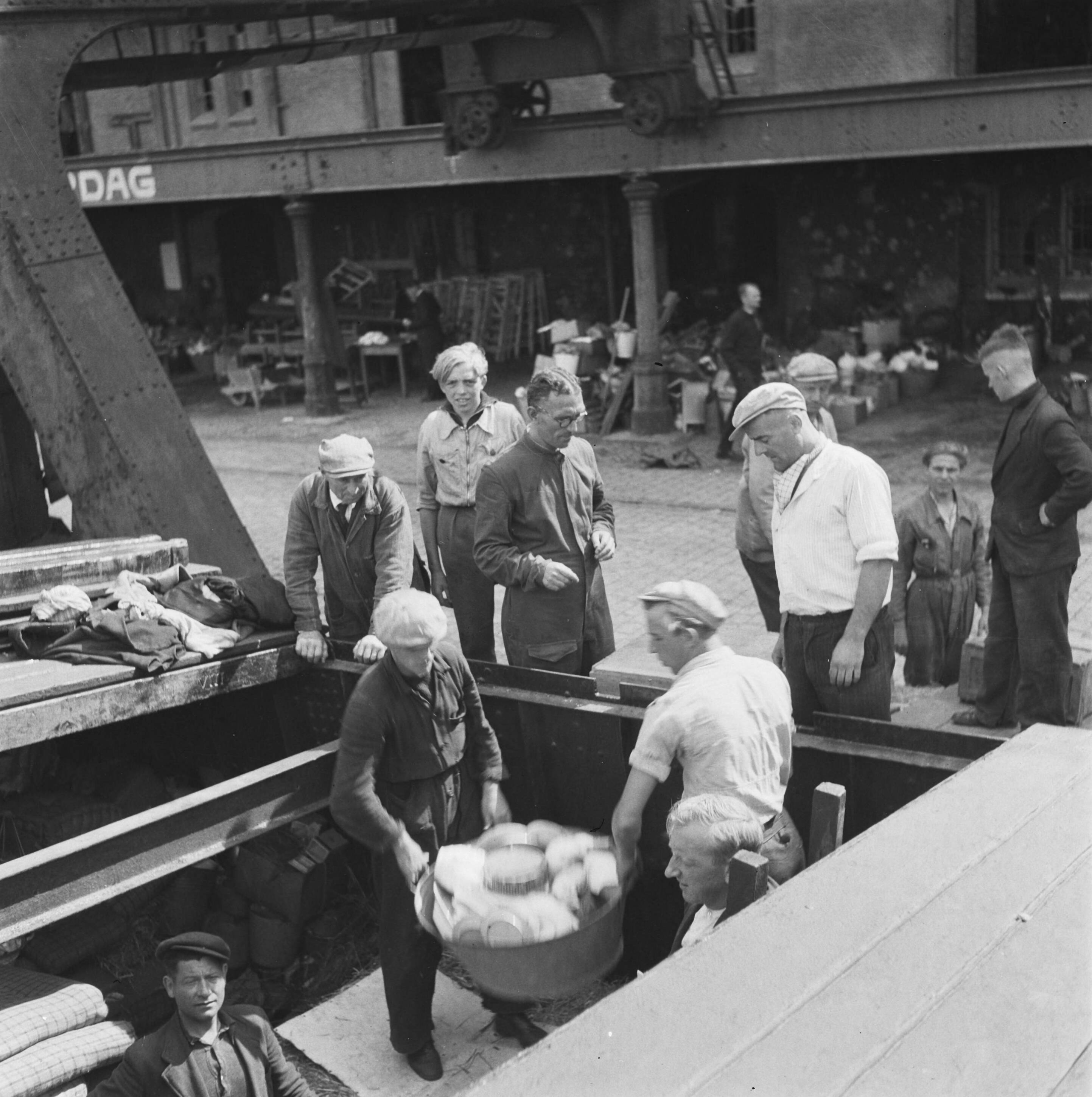 Boten met bestemming Arnhem worden met gebruiksgoederen geladen aan de Cruquiusweg te Amsterdam