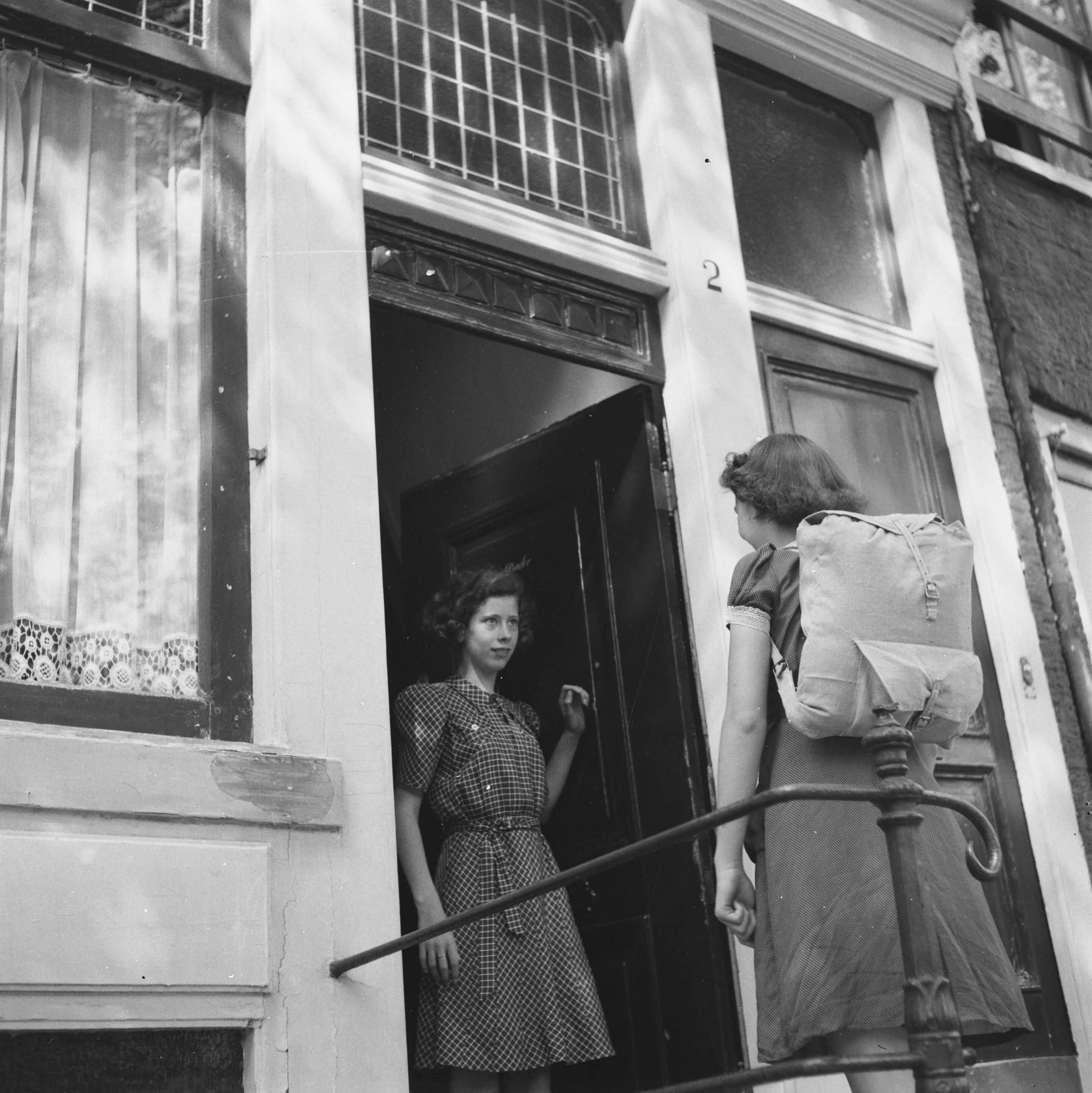 Meisje staat in deuropening huis. Voor haar een meisje met een rugzak