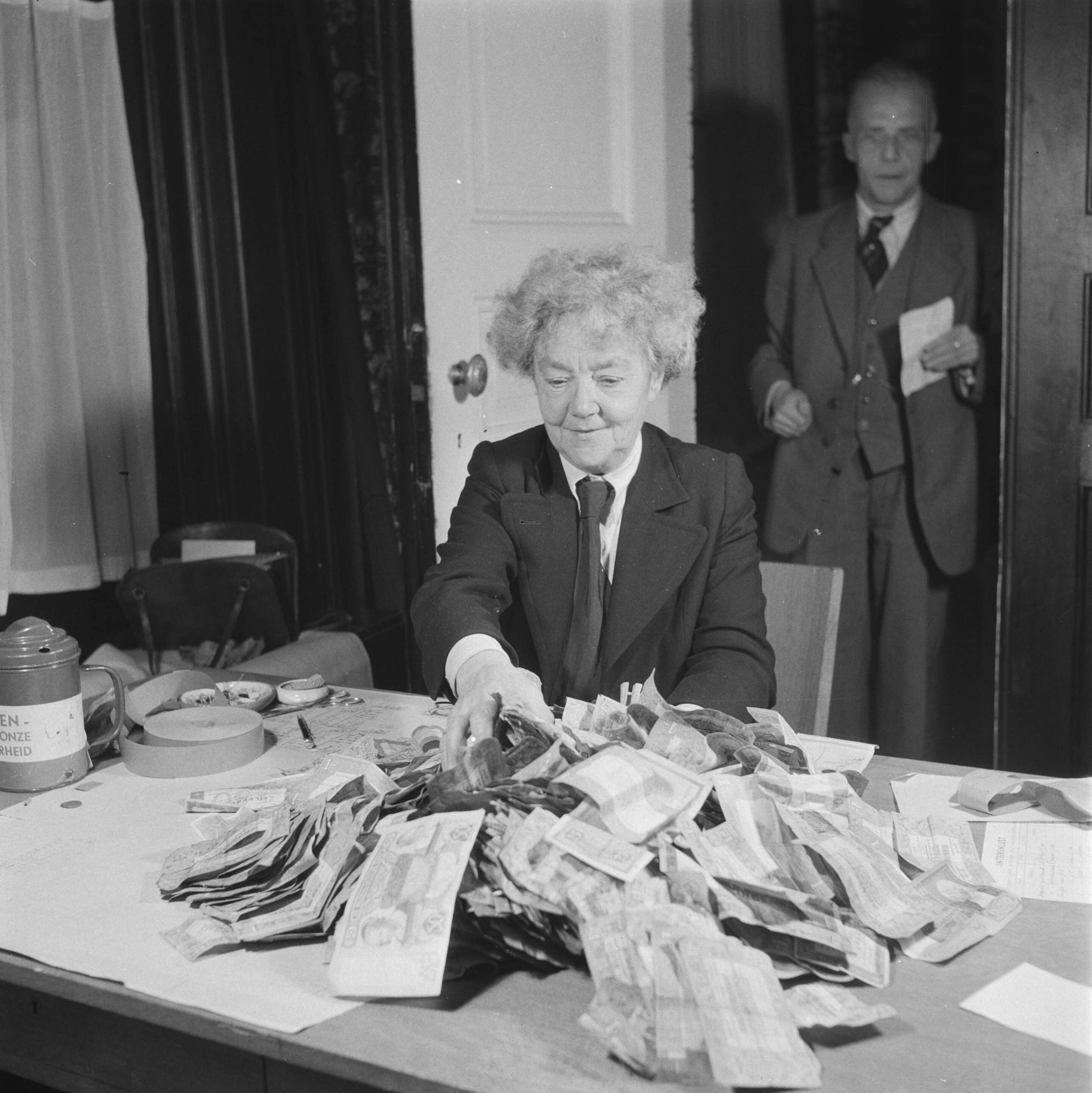 Vrouw achter een tafel met een grote hoeveelheid bankbiljetten