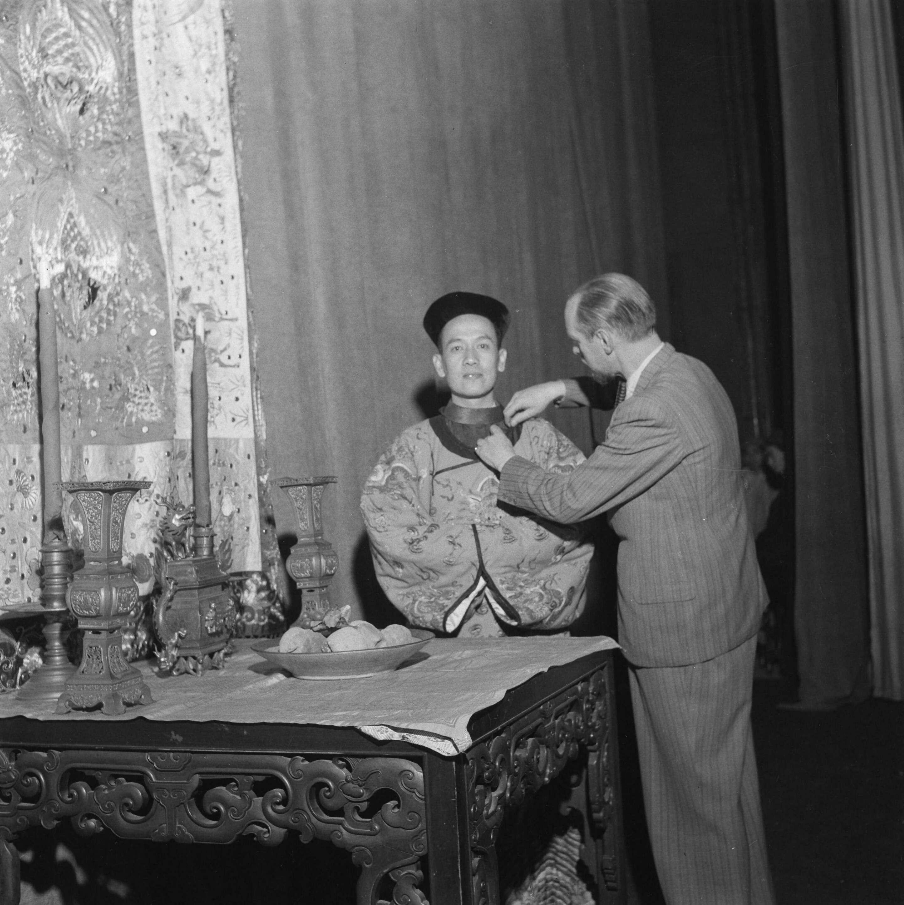 Chinees drakenspel, opgevoerd ter gelegenheid van de bevrijding van Nederland. Mannen in kostuums. Man in Chinees kostuum wordt geholpen door een man in Europees kostuum