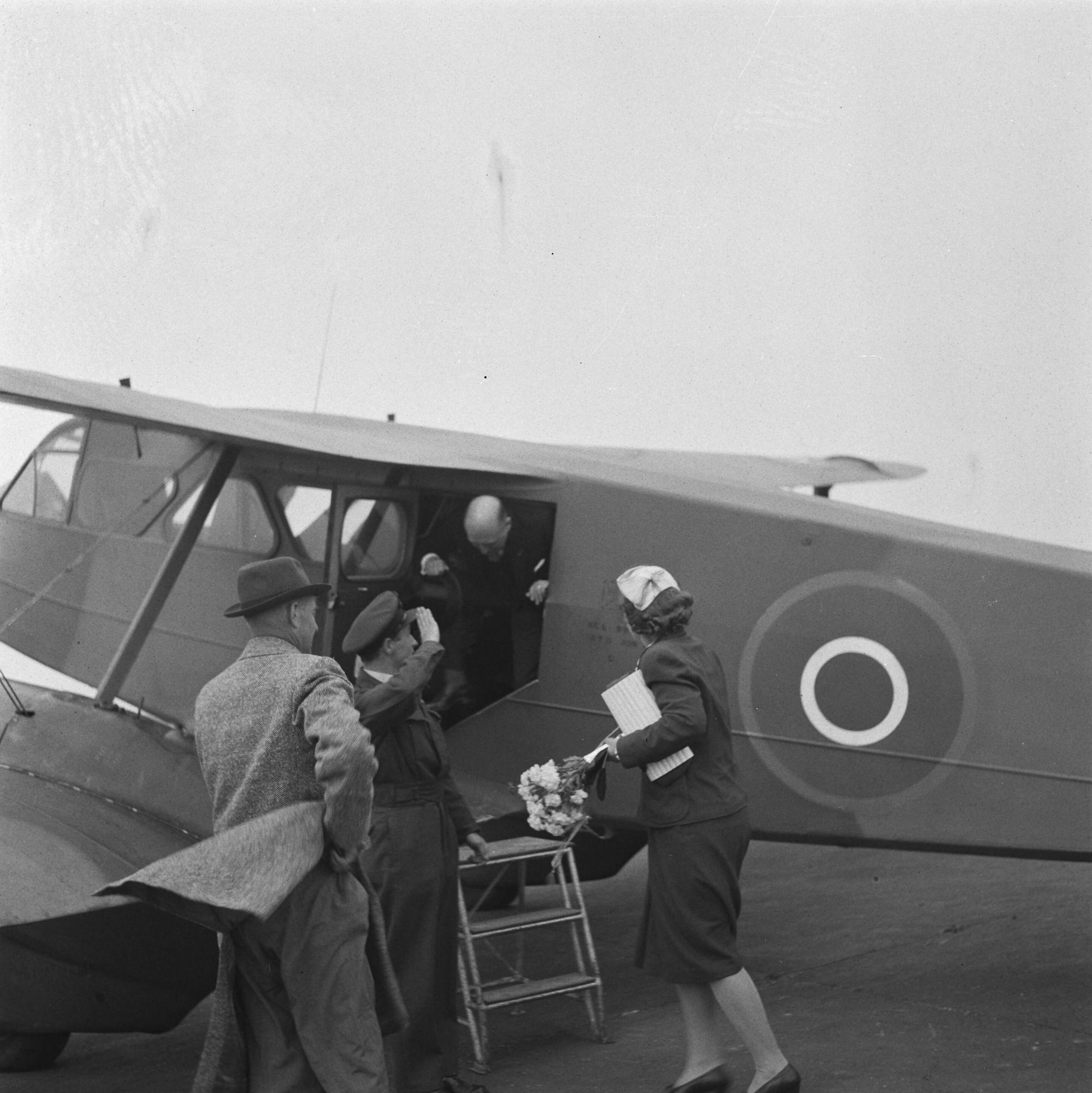 Minister-president Schermerhorn stapt uit een vliegtuig. Gouverneur-generaal Tjarda van Starkenborg Stachouwer op de rug gezien. Rechts prinses Juliana