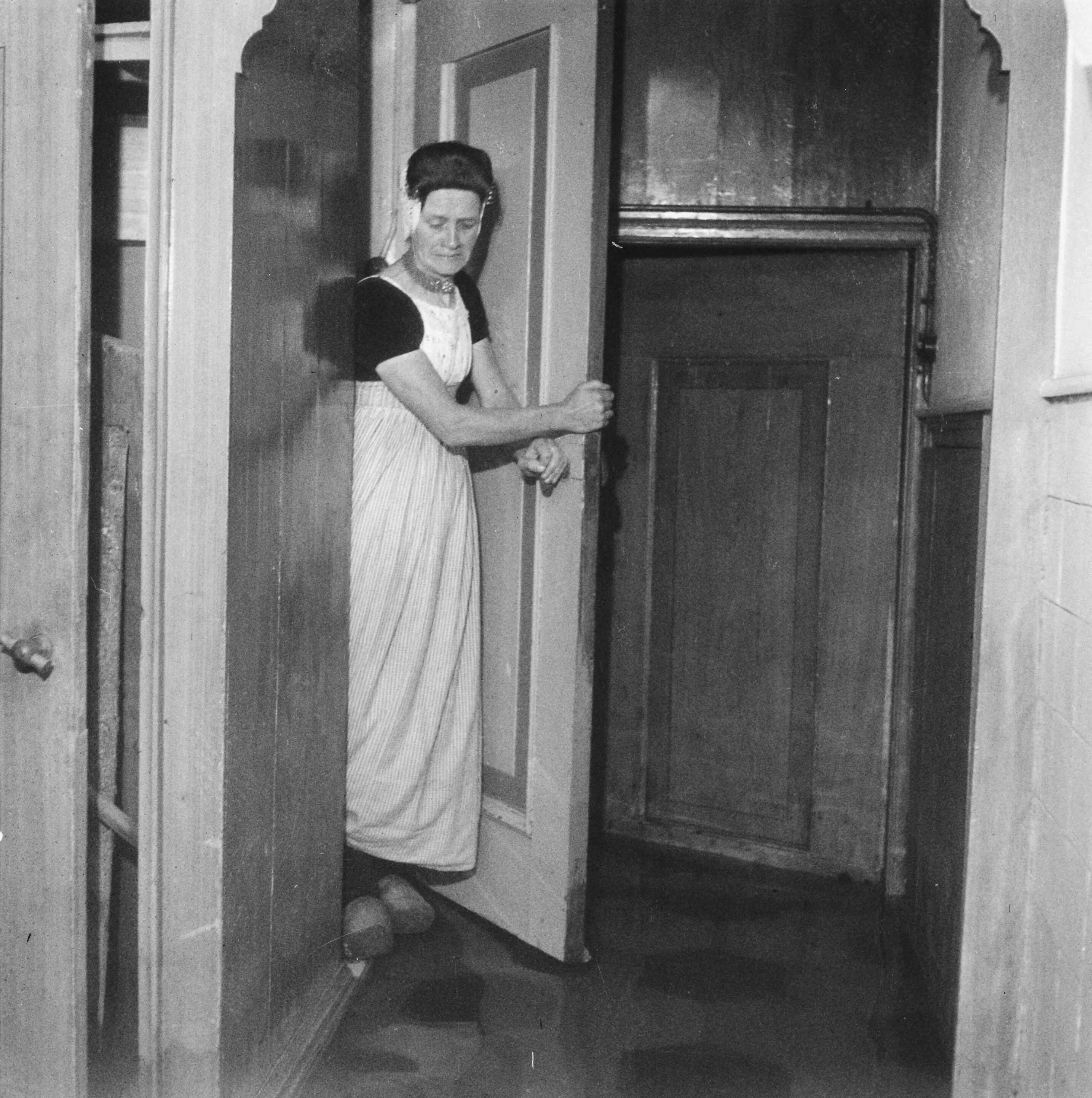 Vrouw in klederdracht opent deur terwijl de vloer blank staat
