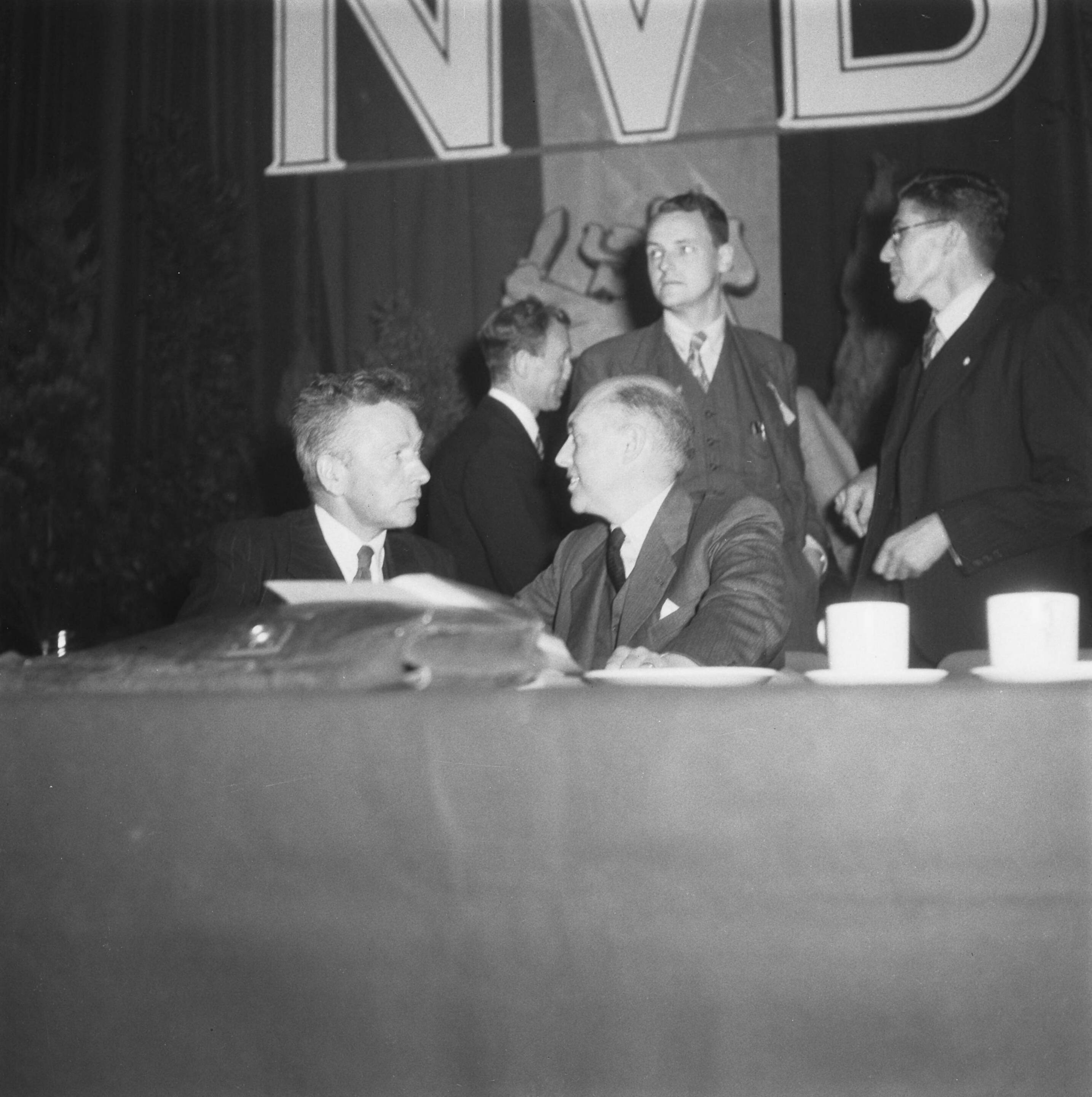 Vergadering van de Nederlandse Volksbeweging (NVB). Achter de bestuurstafel is W. Schermerhorn in gesprek met een bestuurslid