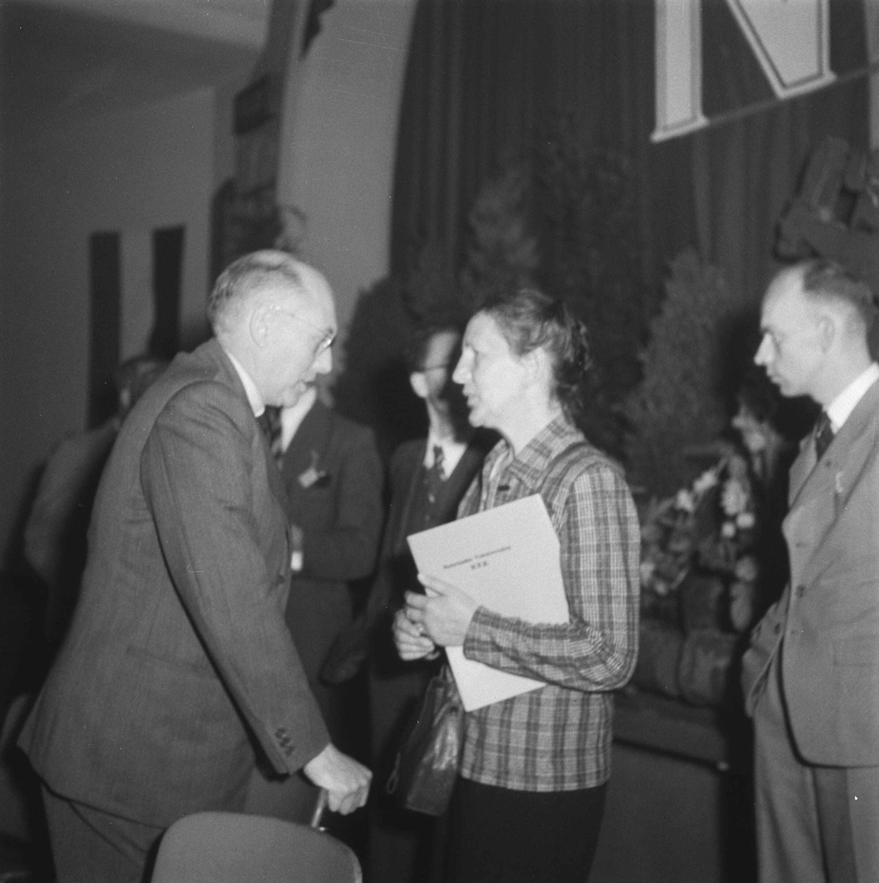 Vergadering van de Nederlandse Volksbeweging (NVB). W. Schermerhorn in gesprek met een vrouwelijk bestuurslid