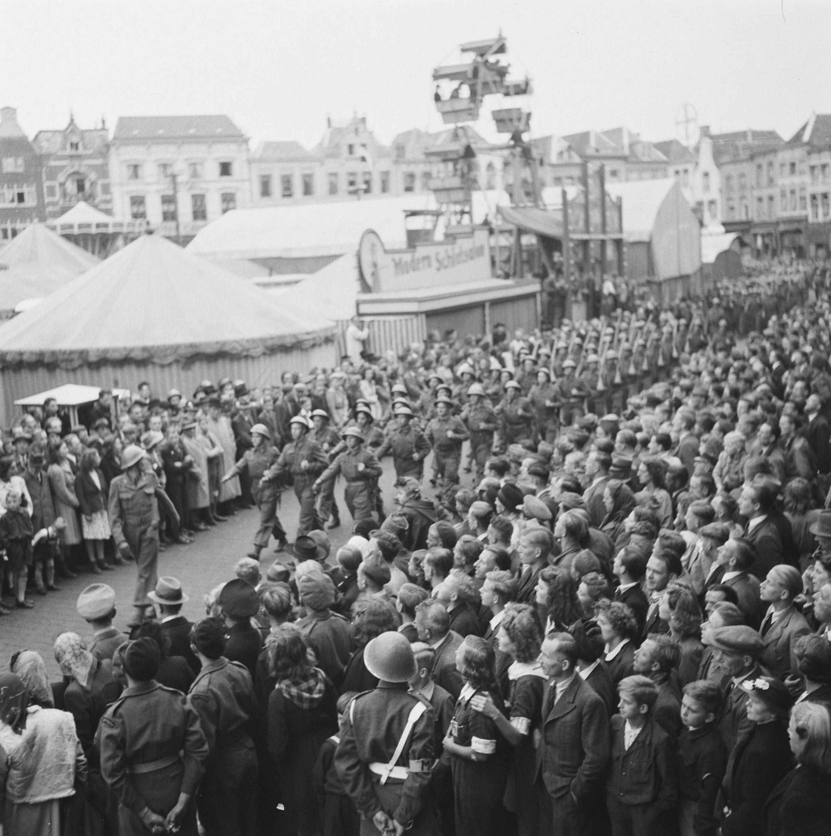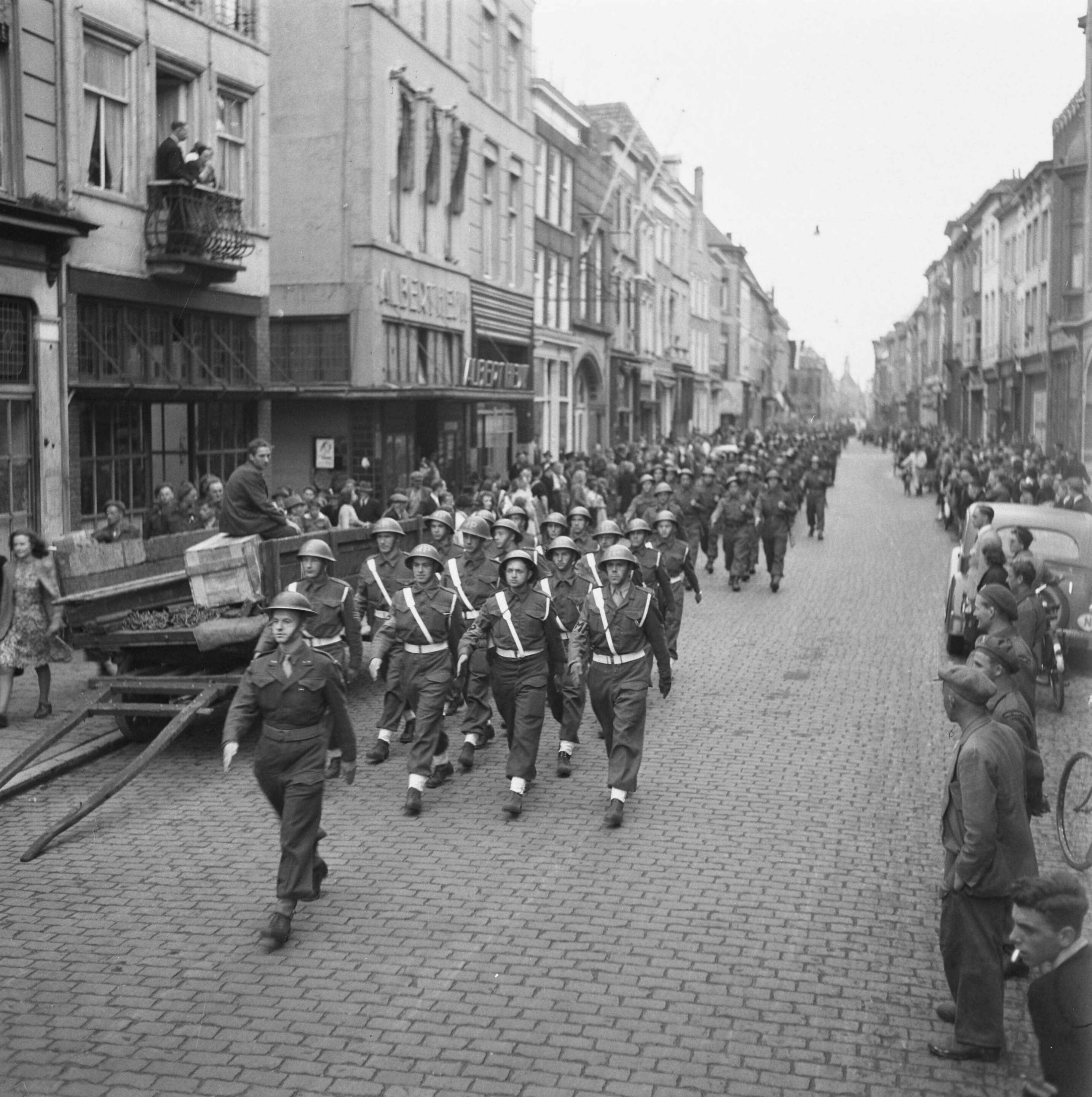 Parade van afzwaaiende troepen door de binnenstad van Den Bosch