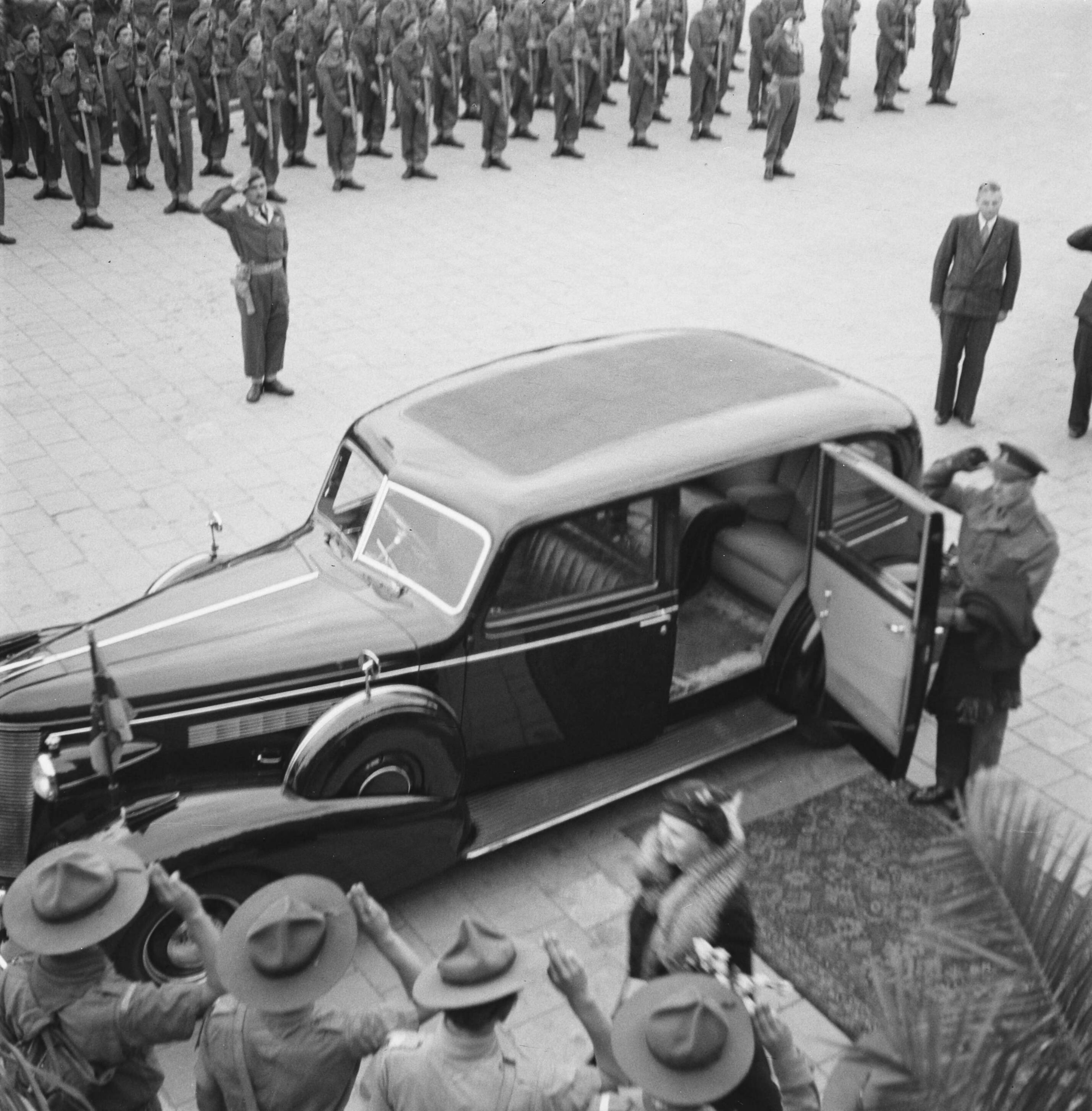 Aankomst koningin Wilhelmina. Zij wordt gegroet door padvinders