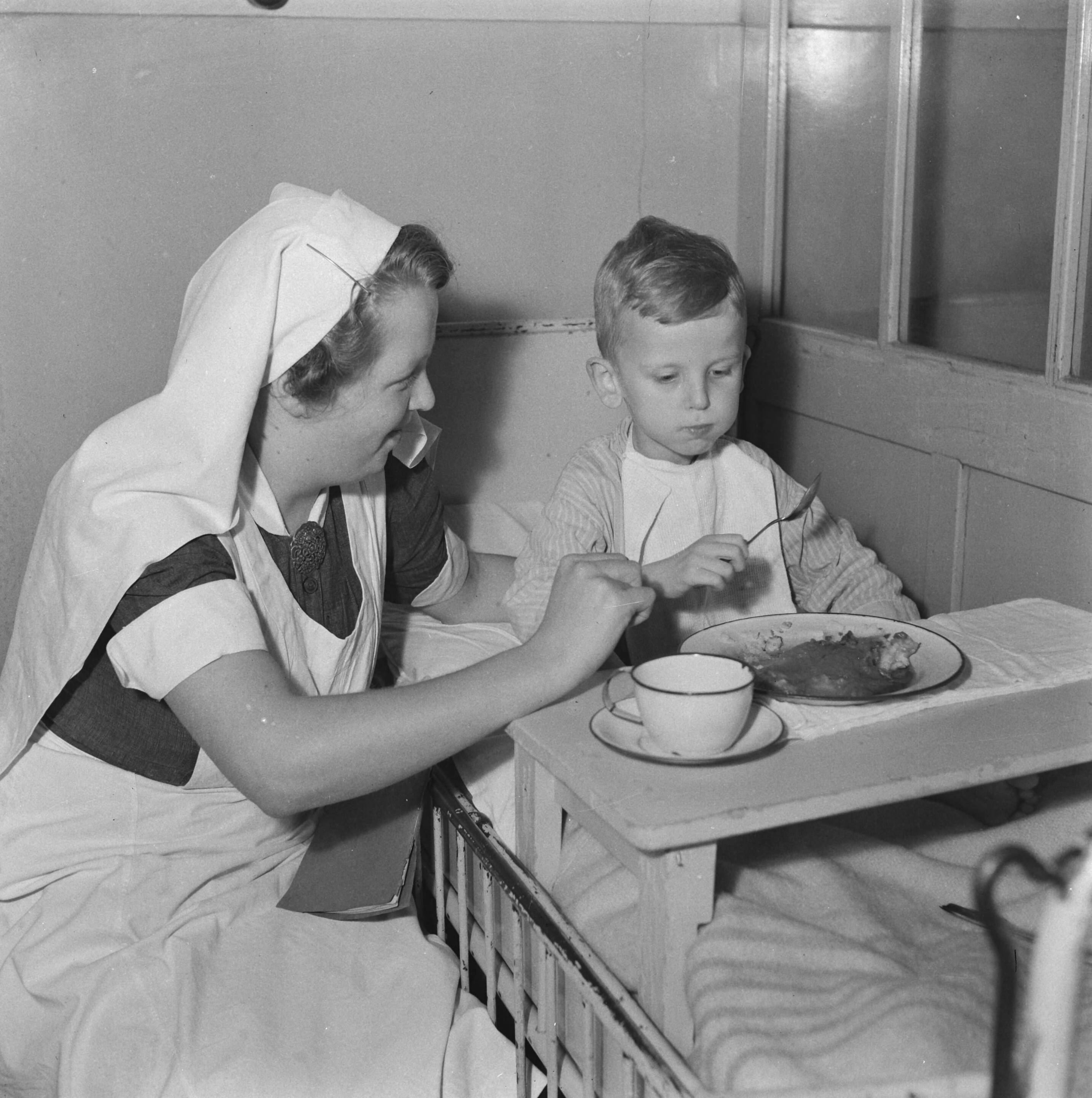 Kleuter eet zelfstandig. Naast hem een verpleegster