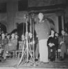 Eisenhower in Amsterdam. Burgerzaal van het Paleis op de Dam. Generaal Eisenhower geflankeerd door minister-president Schermerhorn en burgemeester De Boer