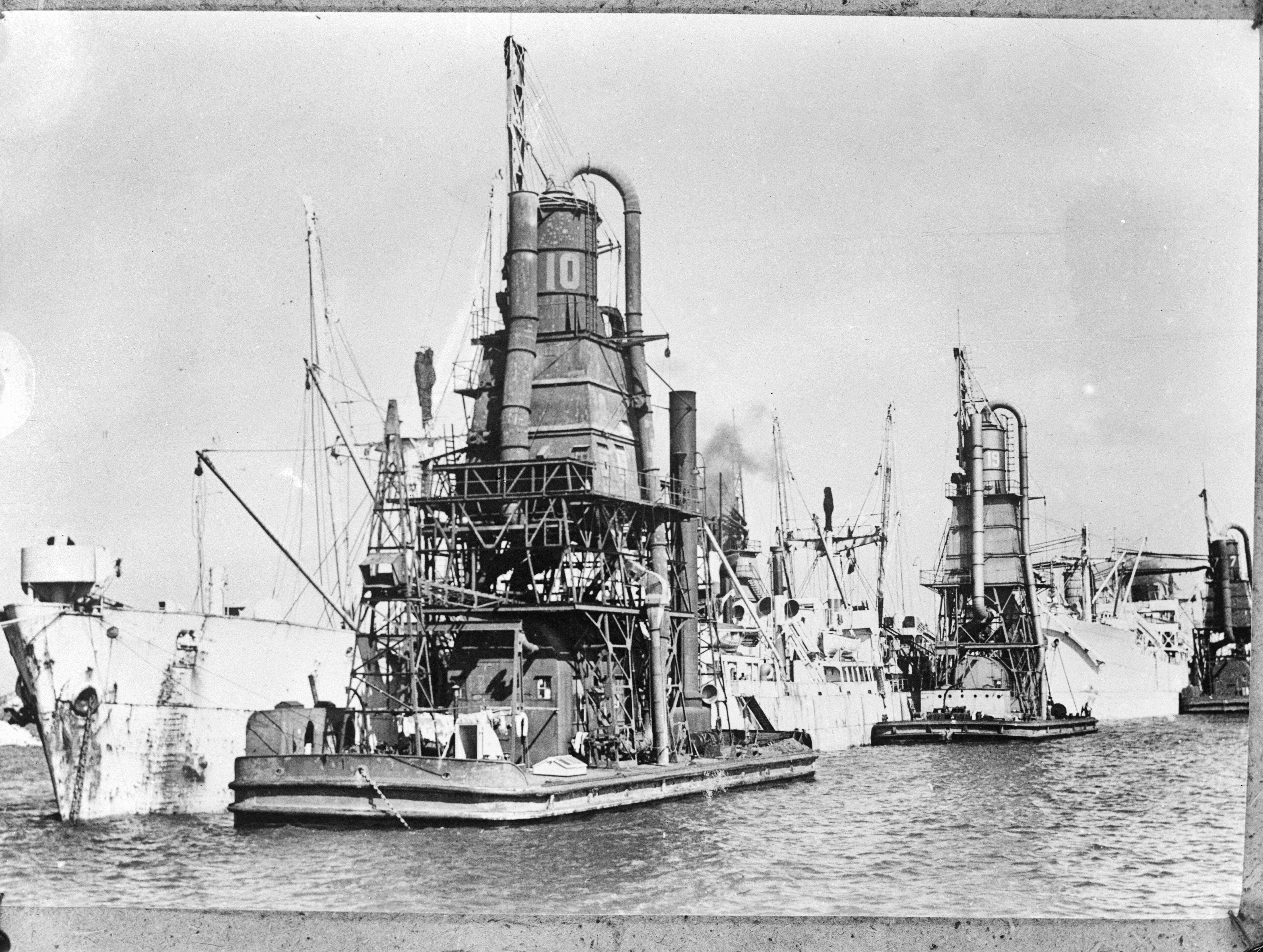 Liberty-schip met graan geladen wordt te Roterdam met elevator gelost