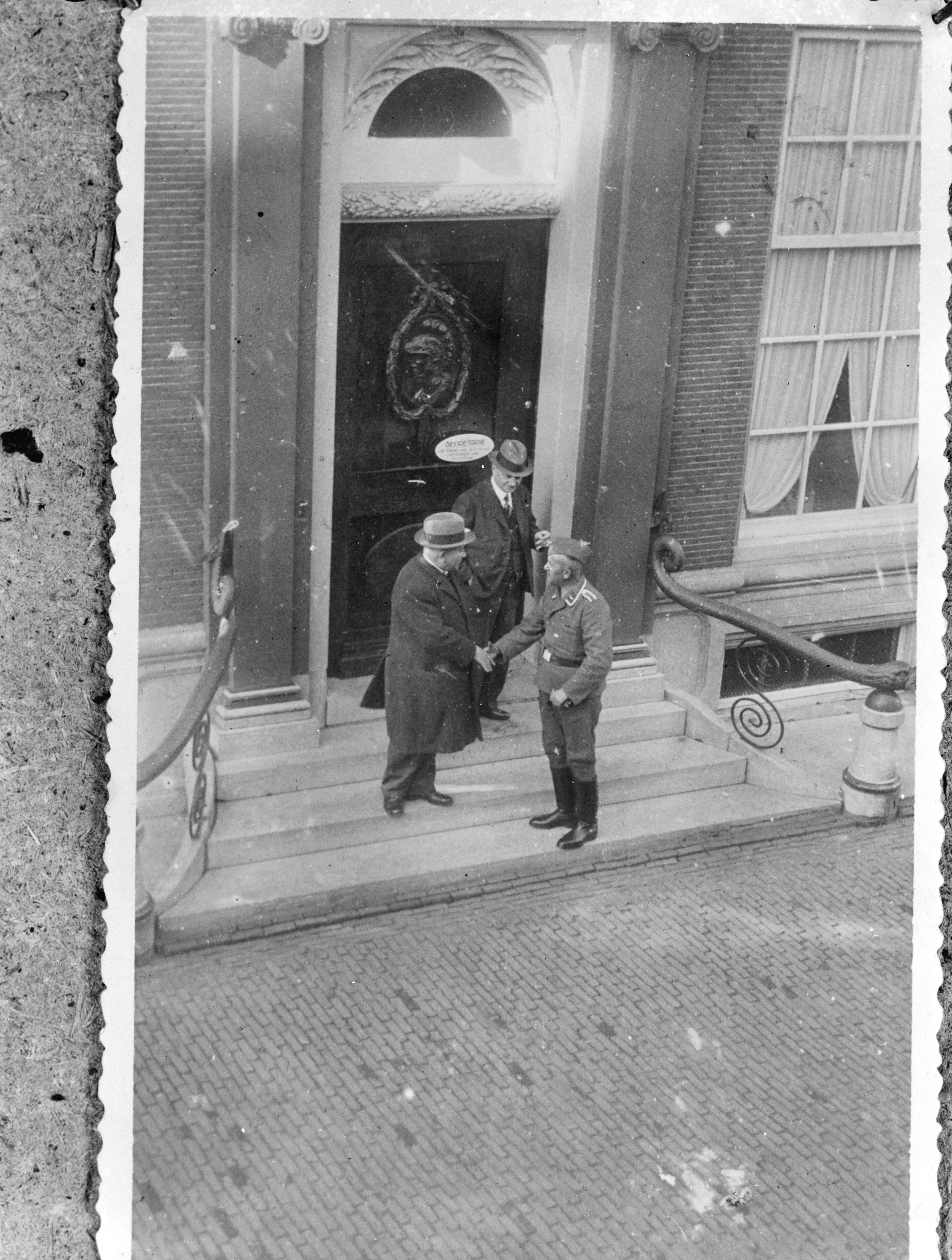 De man in burger van foto 900-9091 schudt de hand van de Duitse Luftwaffe militair. De andere man staat nu in het midden. Op de deur een bord waarop te lezen is "Secretarie". Den Haag?