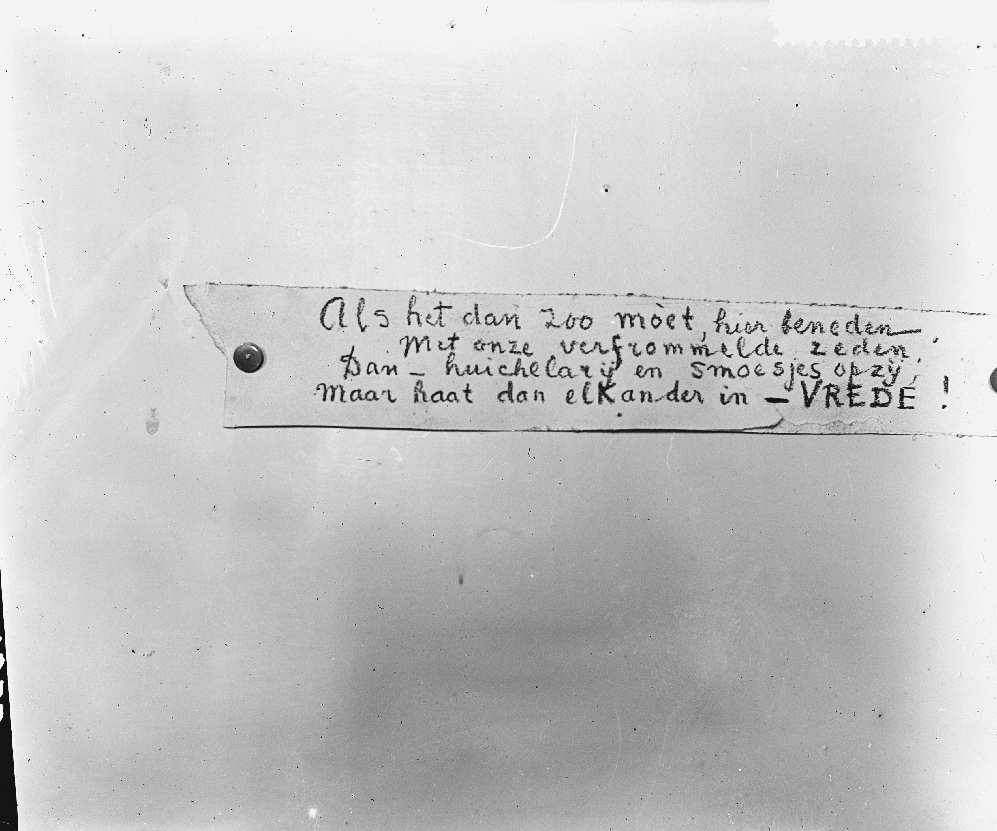 Han van Meegeren opgeprikt briefje met de tekst "Als het dan zoo moet, hier beneden, met onze verfrommelde zeden. Dan - huichelarij en smoesjes opzij. Maar haat dan elkander in - VREDE!"