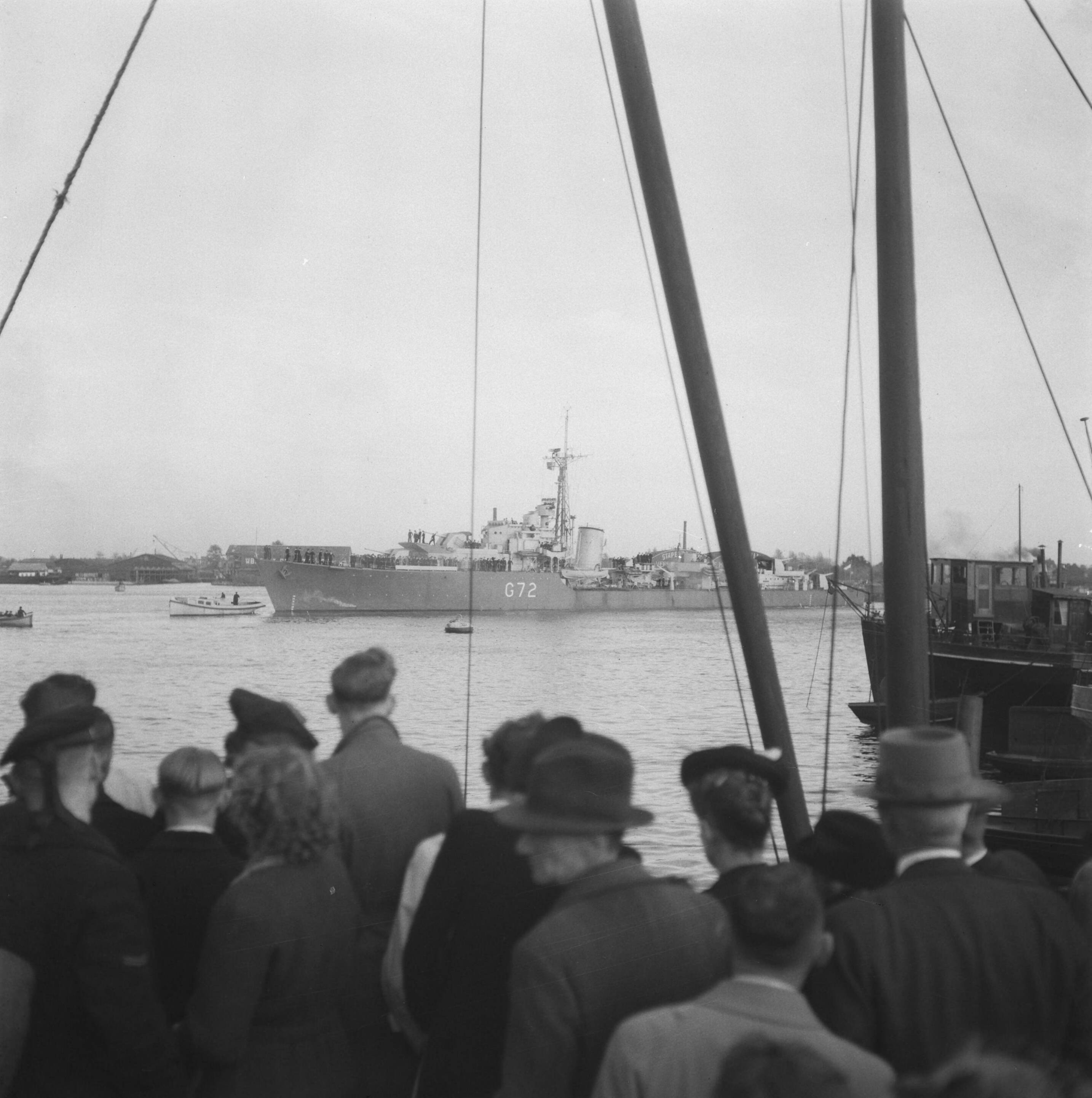 Publiek aan de kade kijkt toe als Hr. Ms. "Kortenaer" aanmeert.