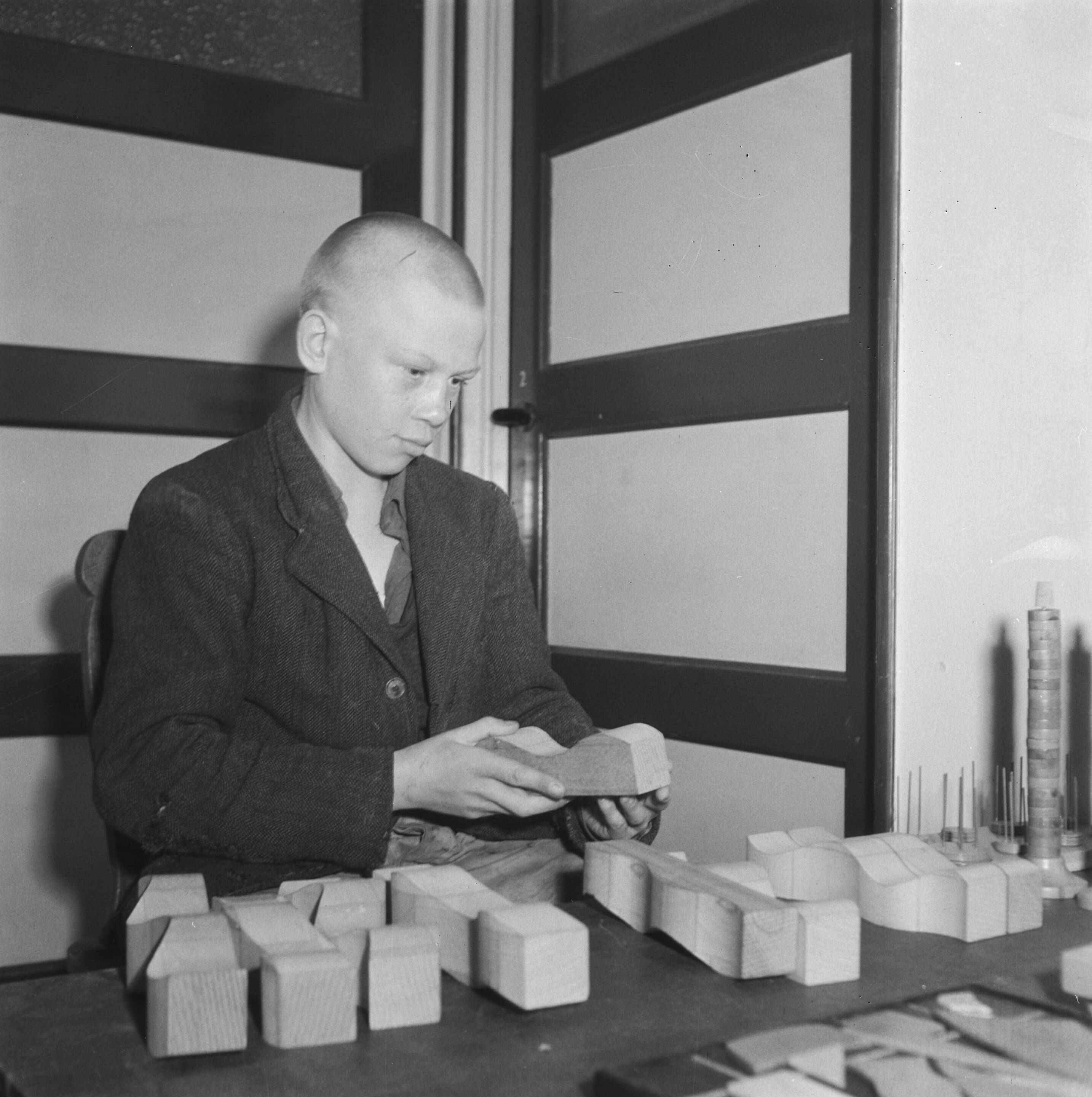 Kaalgeschoren jongen bezig met een test (houten blokken in vormen)
