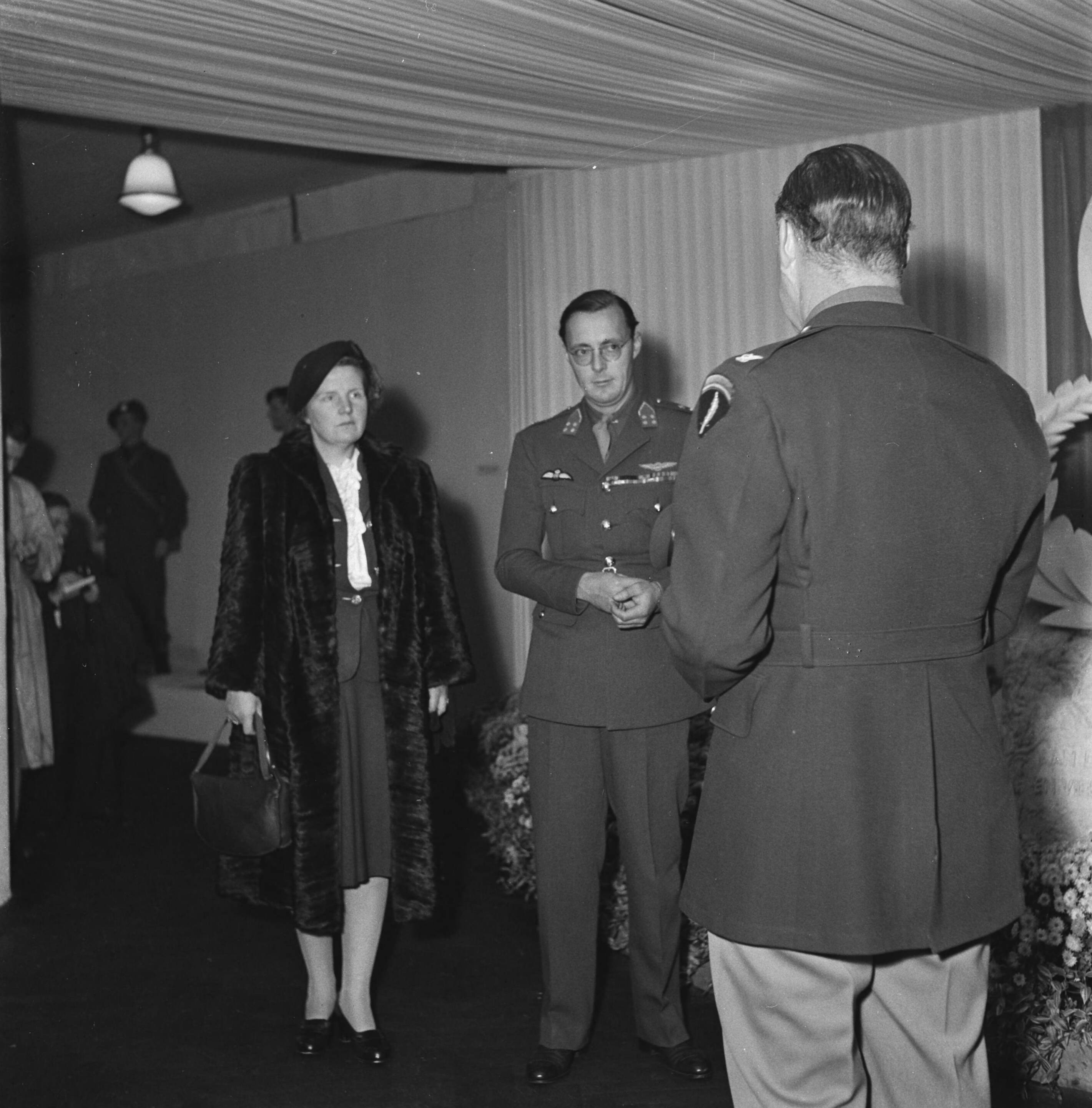 Openingsplechtigheid van de gemeenschappelijke R.A.F. — U.S.A.A.F-tentoonstelling in de Bijenkorf te Den Haag.