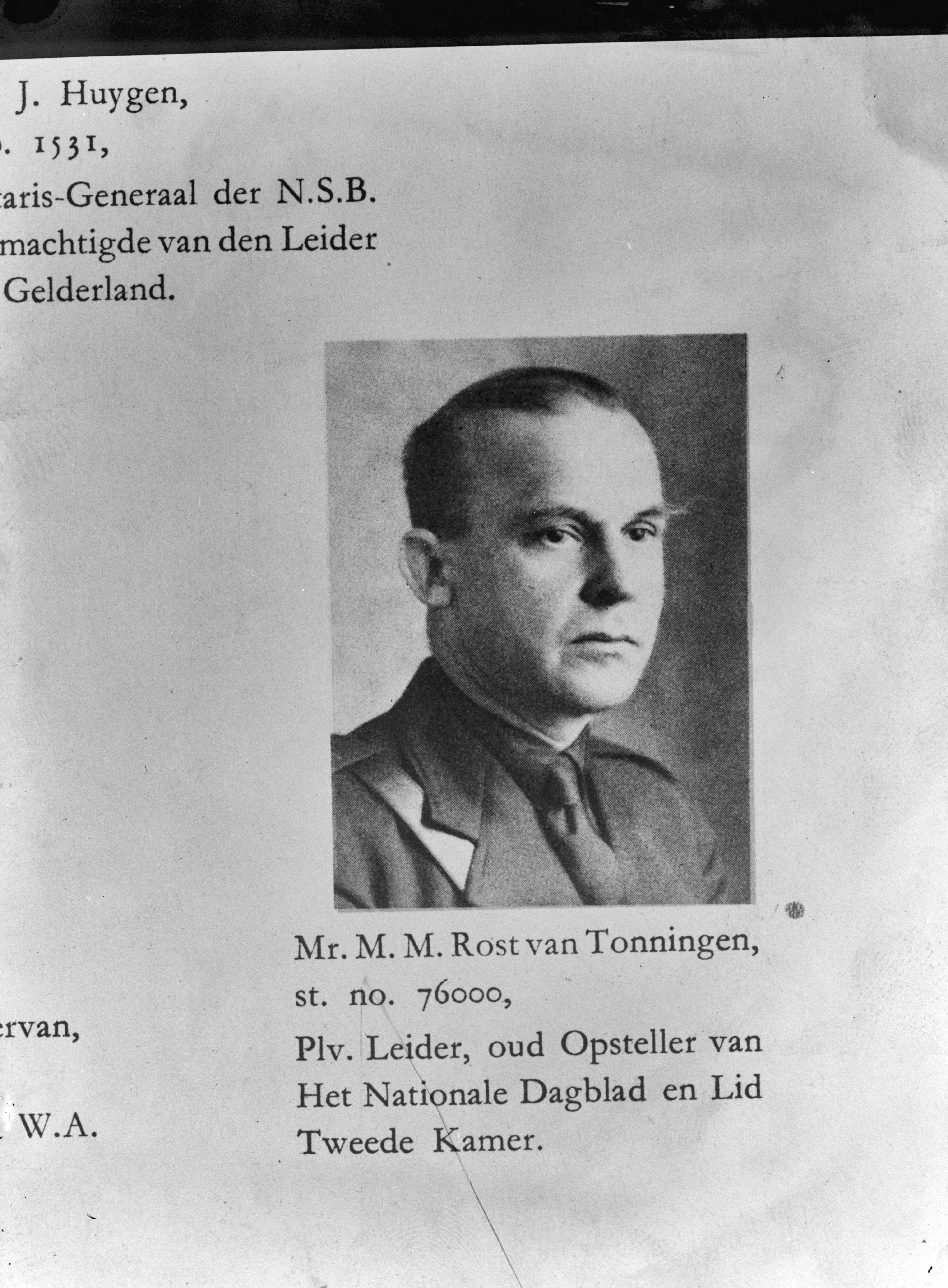 Nationaal-Socialistische Beweging. M.M. Rost van Tonningen. Plaatsvervangend leider, oud-oprichter van het Nationale Dagblad en lid Tweede Kamer