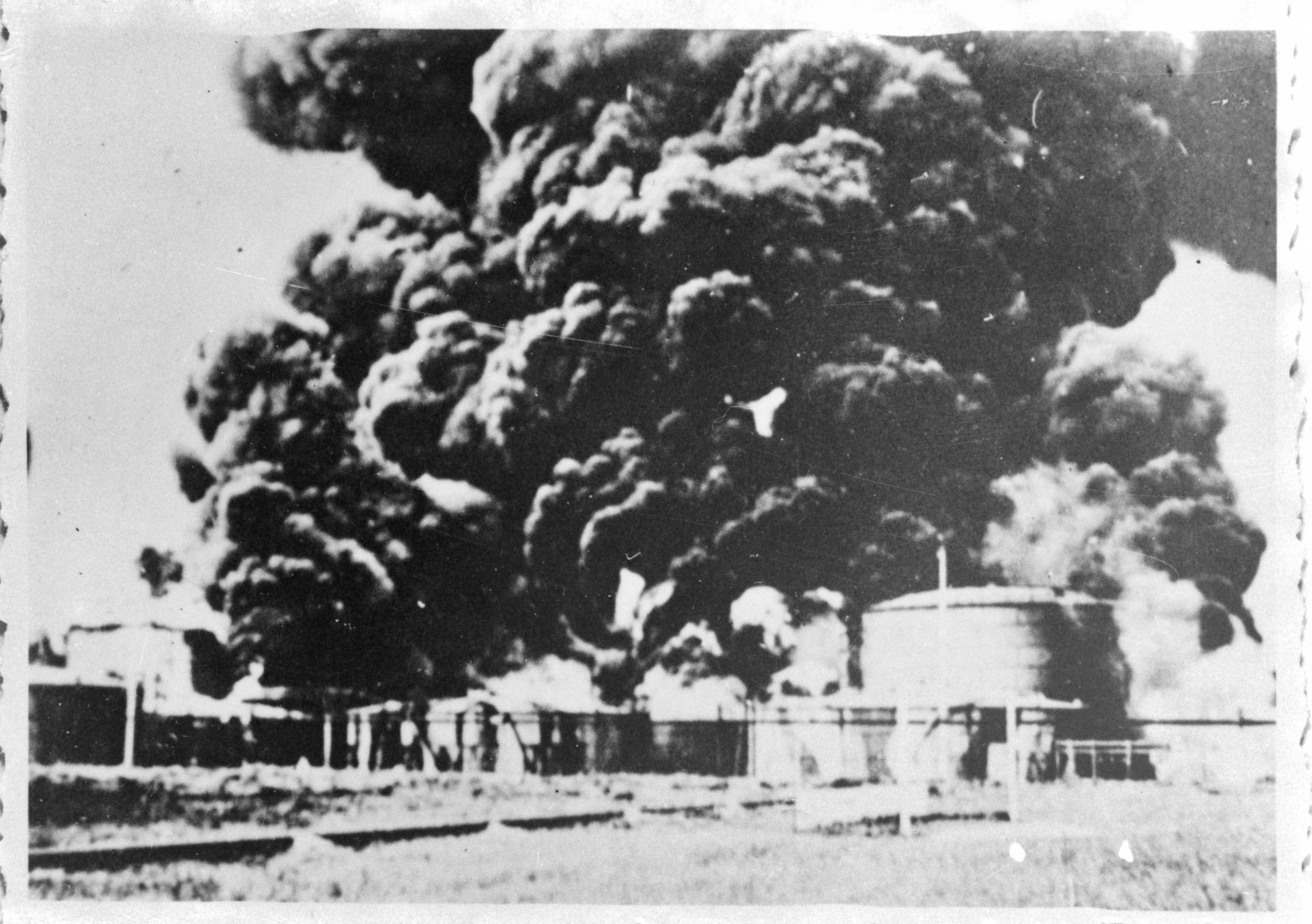 Verwoestingen Rotterdam na bombardement 14 mei 1940. Brandende olietanks in Pernis