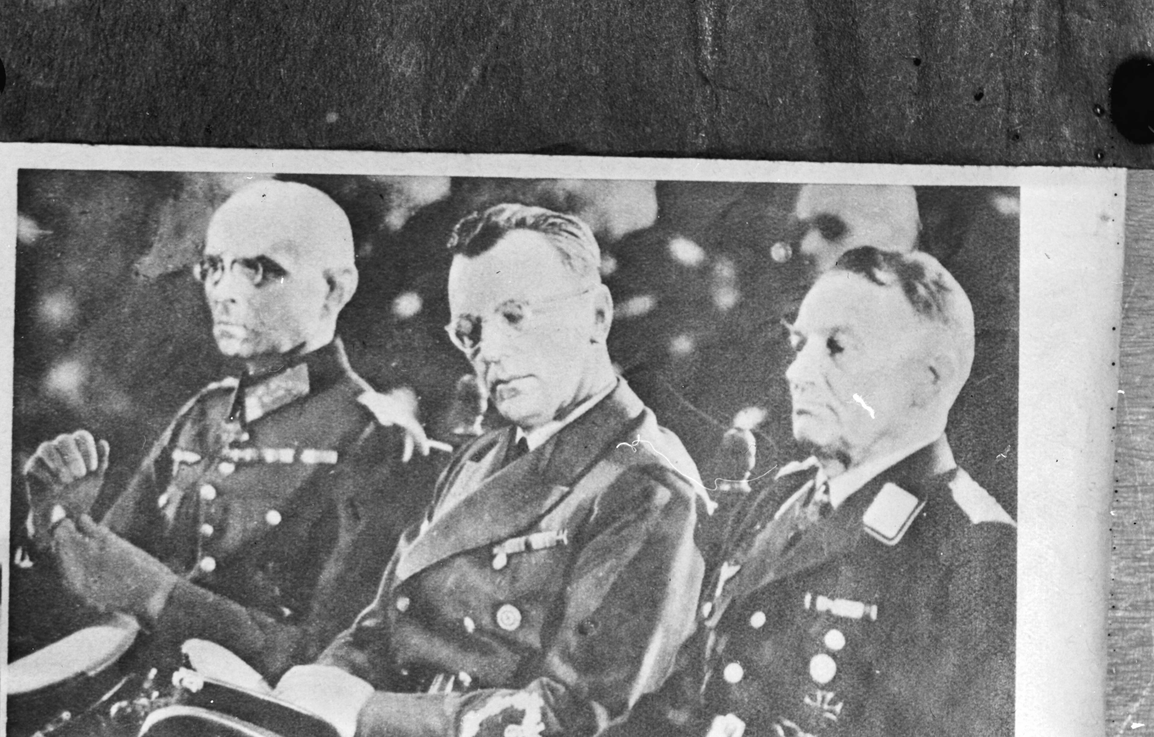 Installatie van Rijkscommissaris dr. Seyss-Inquart in de Ridderzaal te Den Haag. Hij wordt geflankeerd door de generaals Von Falkenhausen (links) en Christiansen