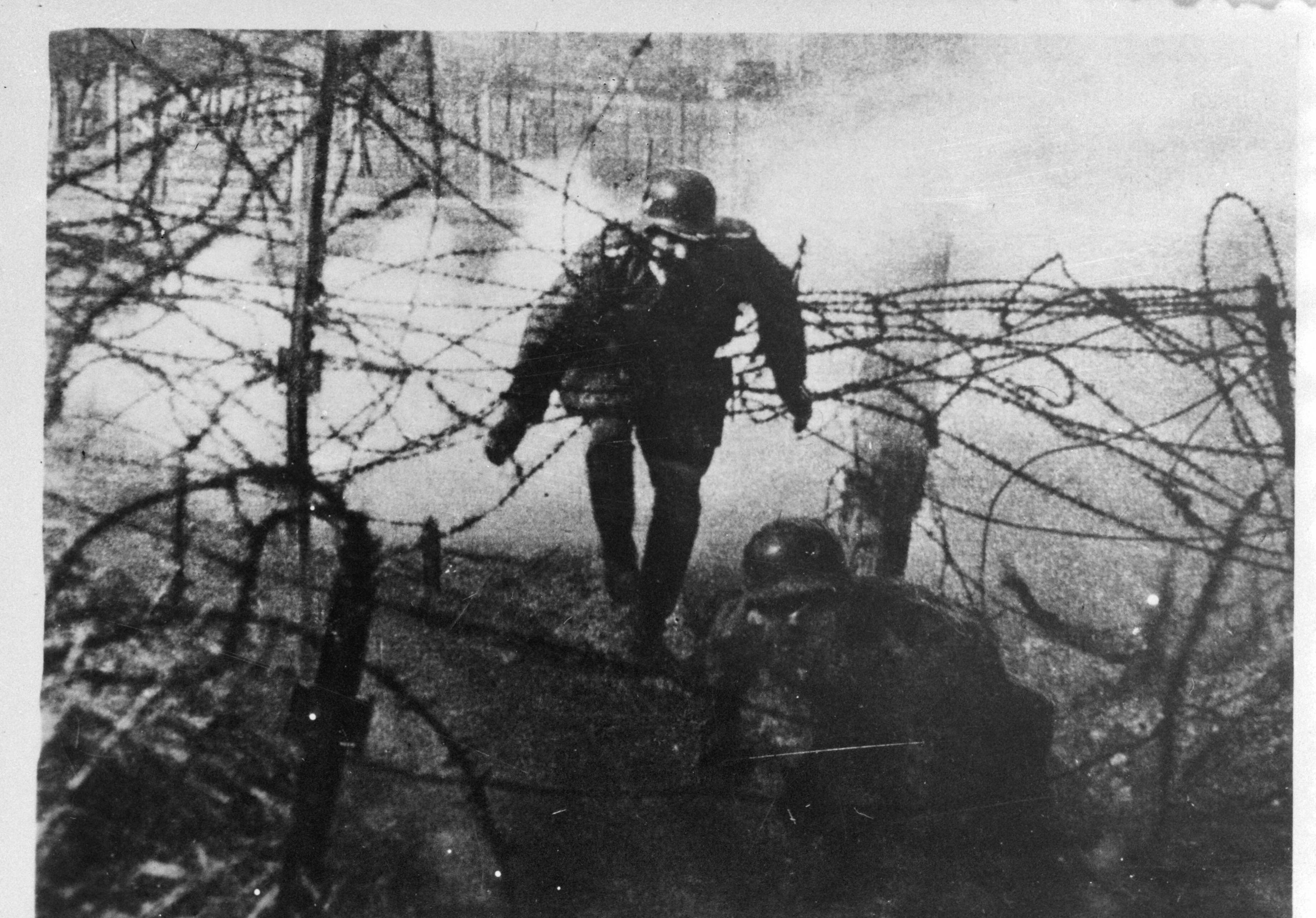 Duitse soldaten manoeuvreren door een prikkeldraadversperring