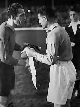 Voetbalwedstrijd tussen België en Nederland op Griffin Park te Brentford. De aanvoerders ruilen vlaggetjes. Links R. Billiet (België) en rechts W. van Oever