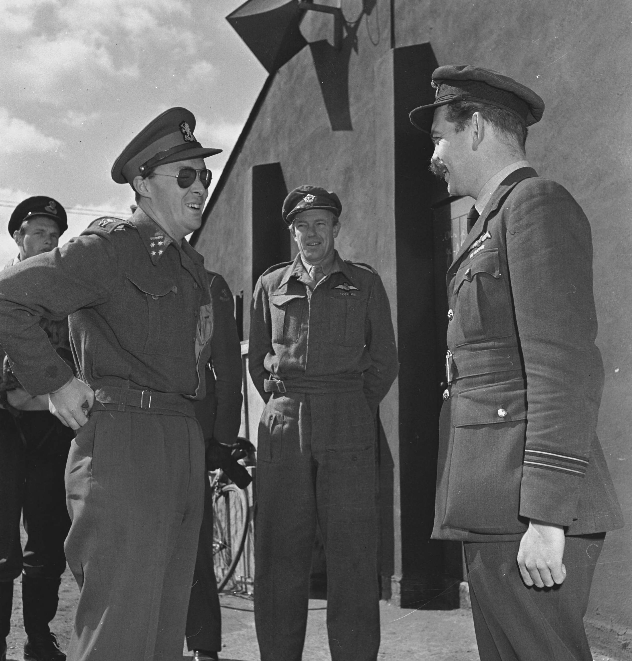 Prins Bernhard tijdens een bezoek aan het Nederlandse Spitfire squadron 322 Dutch Squadron RAF op een RAF basis ergens in Engeland RAF Hartford Bridge