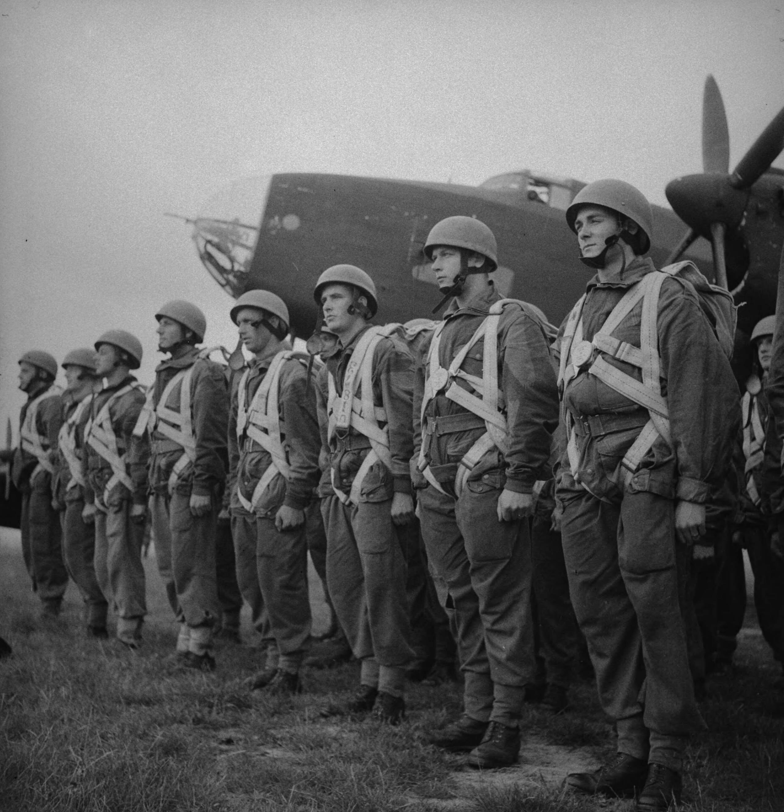 Nederlandse soldaten worden door de RAF getraind als parachutisten. Manschappen opgesteld voor de vliegtuigen