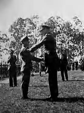 Koninklijk Nederlands-Indisch Leger (KNIL); uitreikingen onderscheidingen Militaire Willems Orde in Camp Columbia te Brisbane. Sergeant M.C. Kokkelink wordt gefeliciteerd door generaal-majoor N.L.W. van Straten