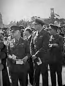 Ceremonie bij de Shrine of Rembembrance te Brisbane t.g.v. het einde van de oorlog in de Pacifische Oceaan. Luitenant-kolonel F.H. Wright (links), Nederlands consul, met generaal-majoor N.L.W. van Straten (midden), chef-staf KNIL