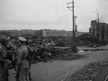 Capitulatie van Japan. Leden van de geallieerde bezettingsmacht in de straten van Yokohama. De verwoestingen aangebracht door geallieerde bombardementen zijn overal te zien