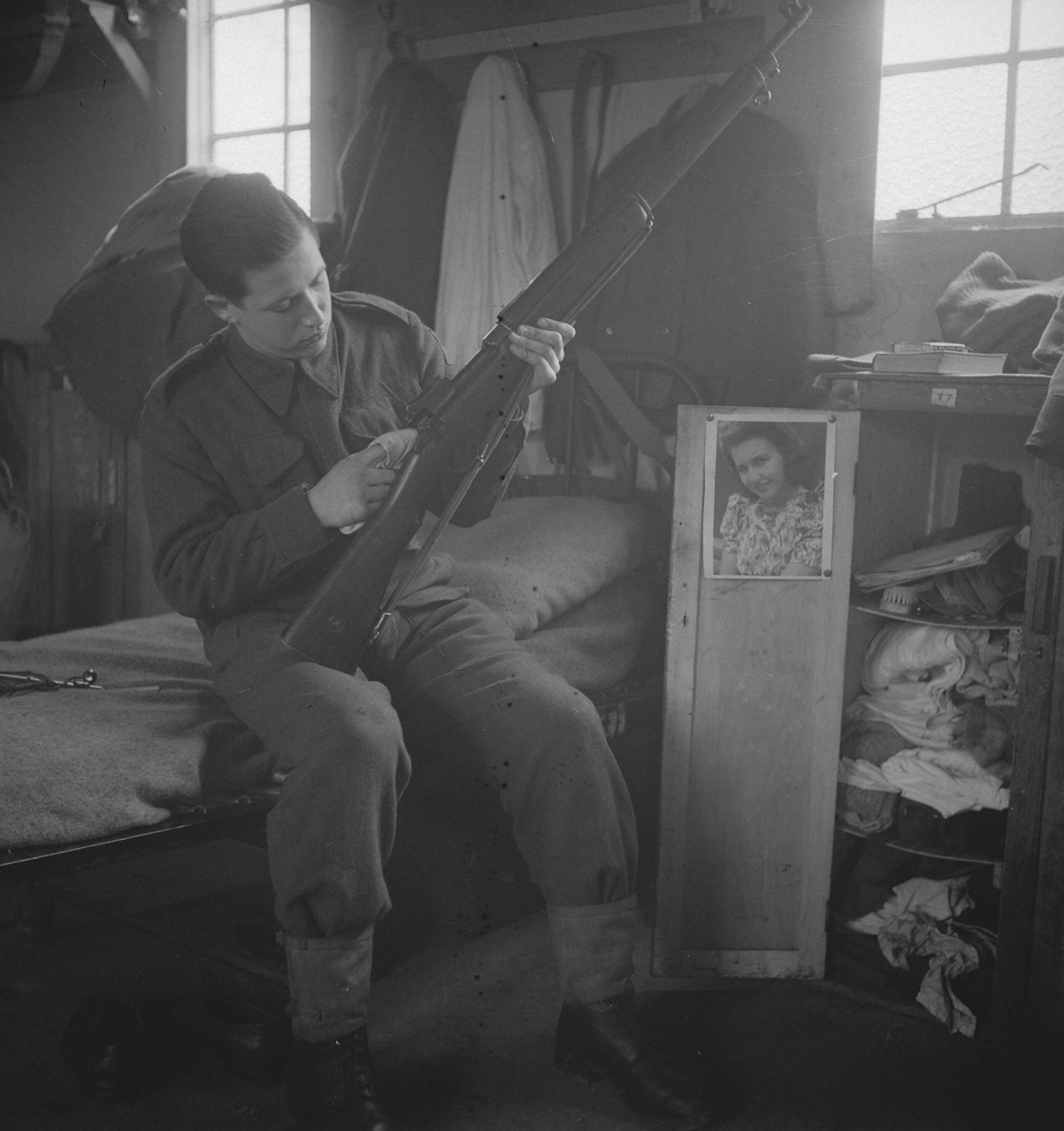 Army 640 Care for his weapons, but his thoughts are far away. Het Nederlandse Legerkamp in Wolverhampton. Het dagelijks leven in het Kamp. Zorg voor zijn wapen, maar zijn gedachten zijn ver weg.