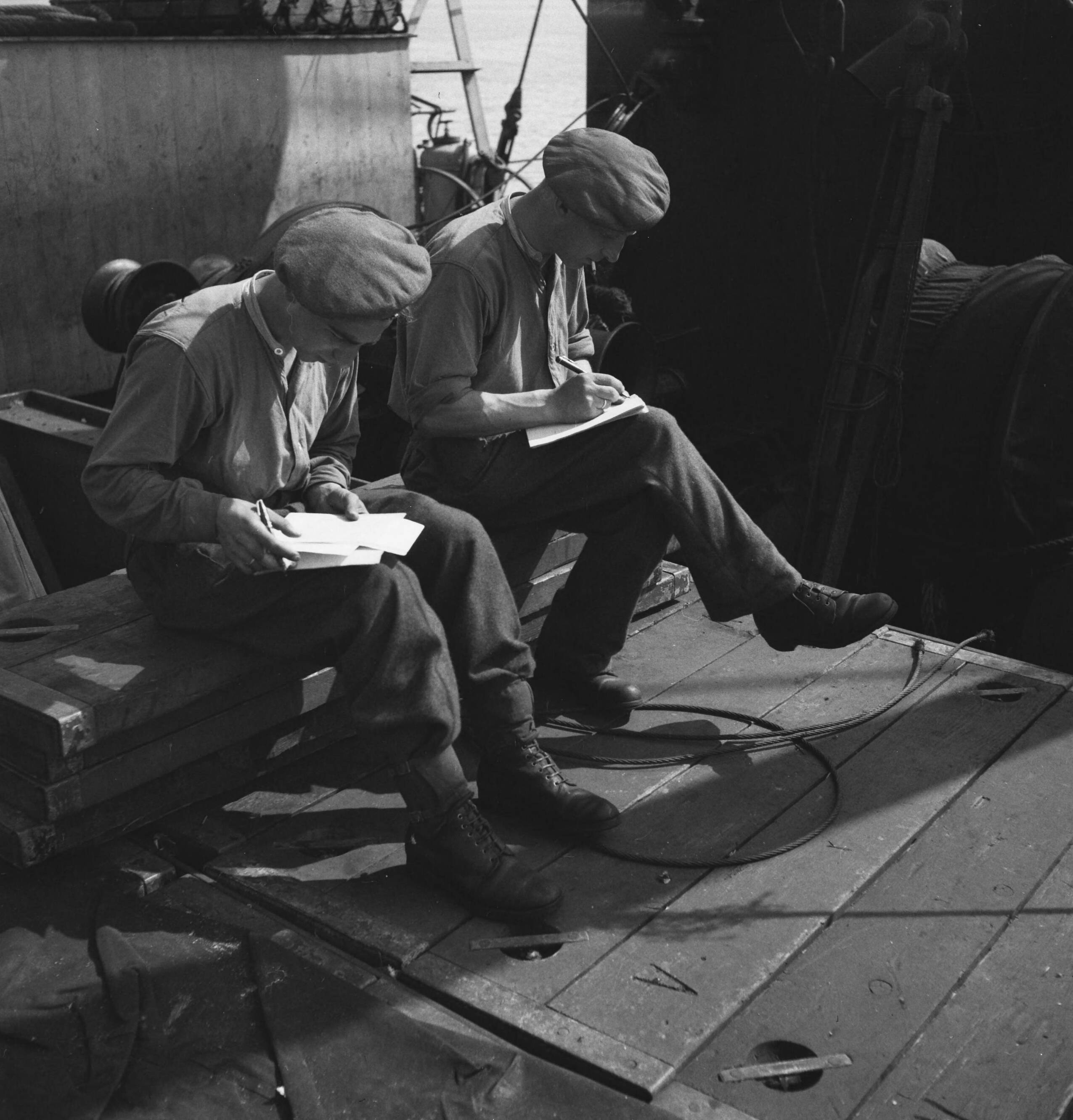 Koninklijke Nederlandse Brigade Prinses Irene. Soldaten schrijven naar huis. De post wordt tweemaal per dag verzameld