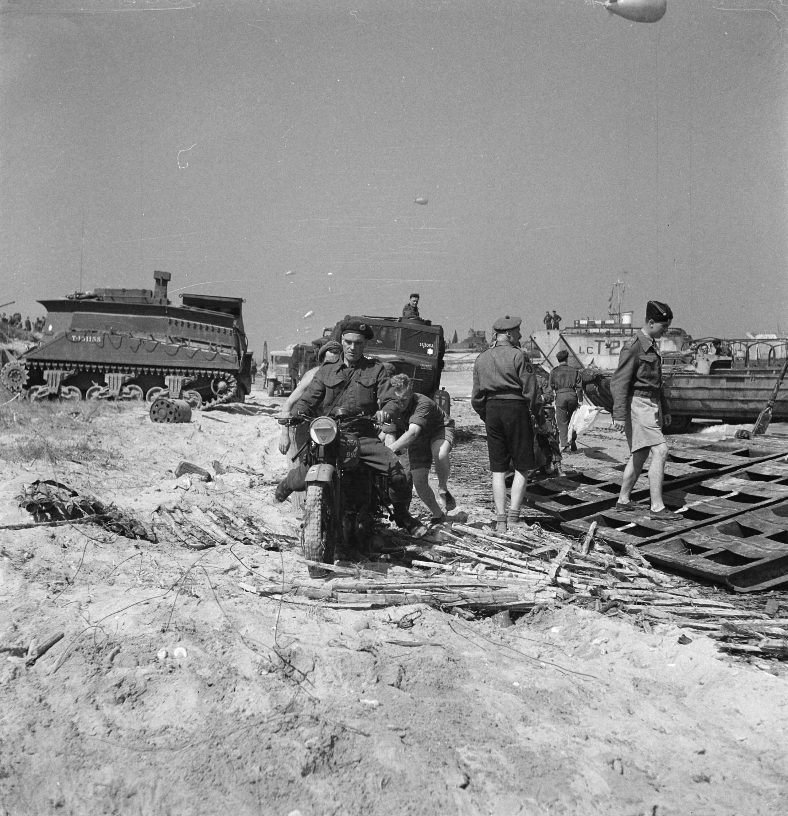 Koninklijke Nederlandse Brigade Prinses Irene. Landing in Normandië een motorrijder krijgt een zetje op het rulle zand van het strand