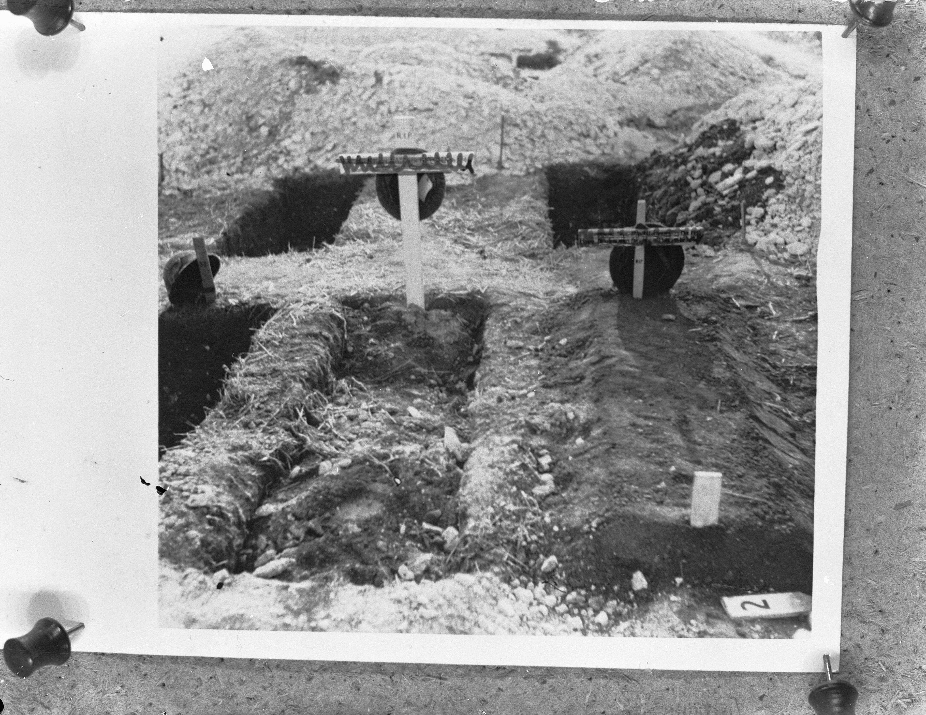 Koninklijke Nederlandse Brigade Prinses Irene. Frans-Canadese sector. Graven van eerste twee gesneuvelde Nederlanders in Ranville. Links soldaat N. den Breejen (gesneuveld 15-8-1944) en sergeant P.W.H. Lammers (gesneuveld 14-8-1944)