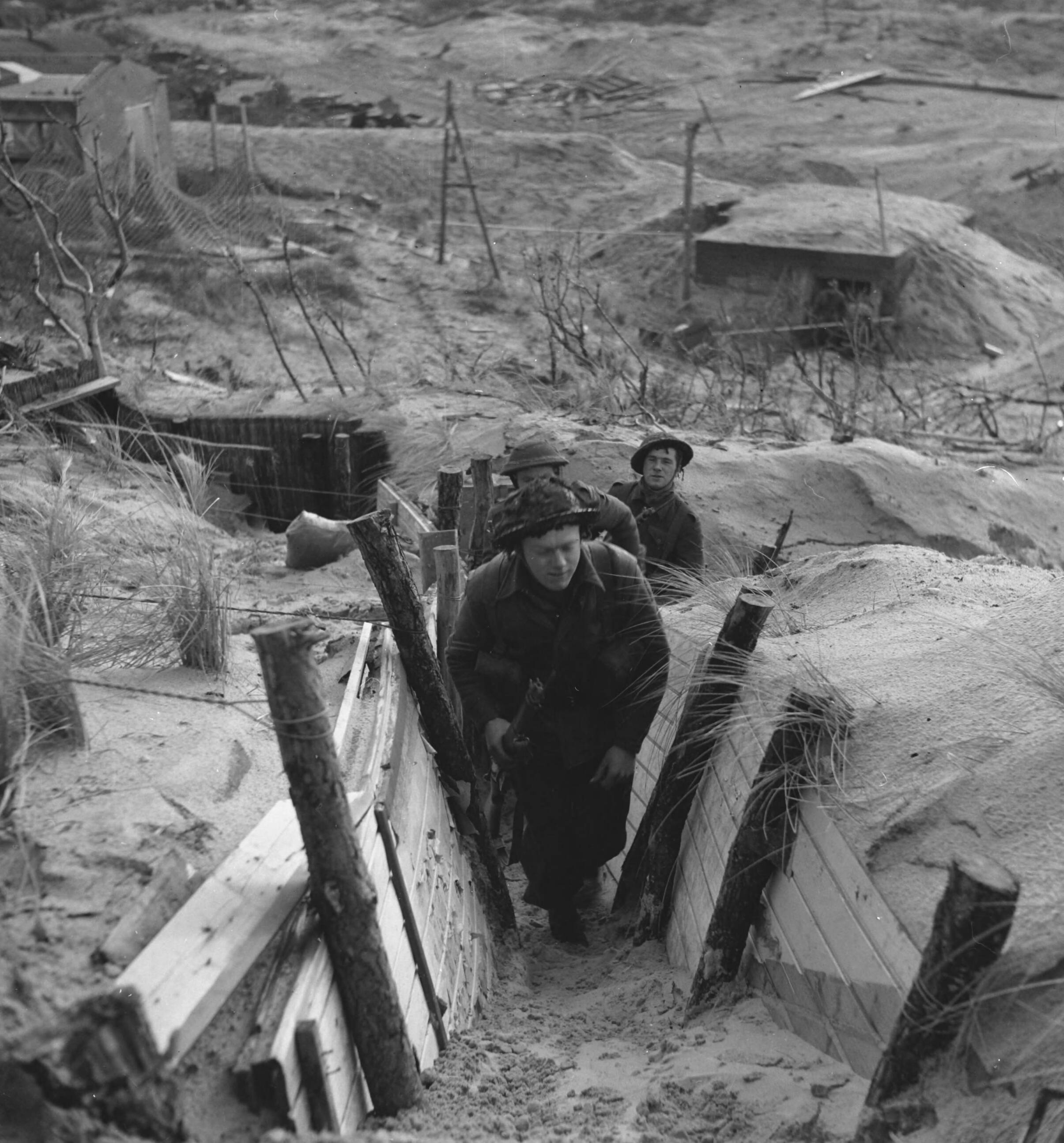 Prinses Irene Brigade in Nederland.Lopend door voormalige Duitse loopgraven in de duinen