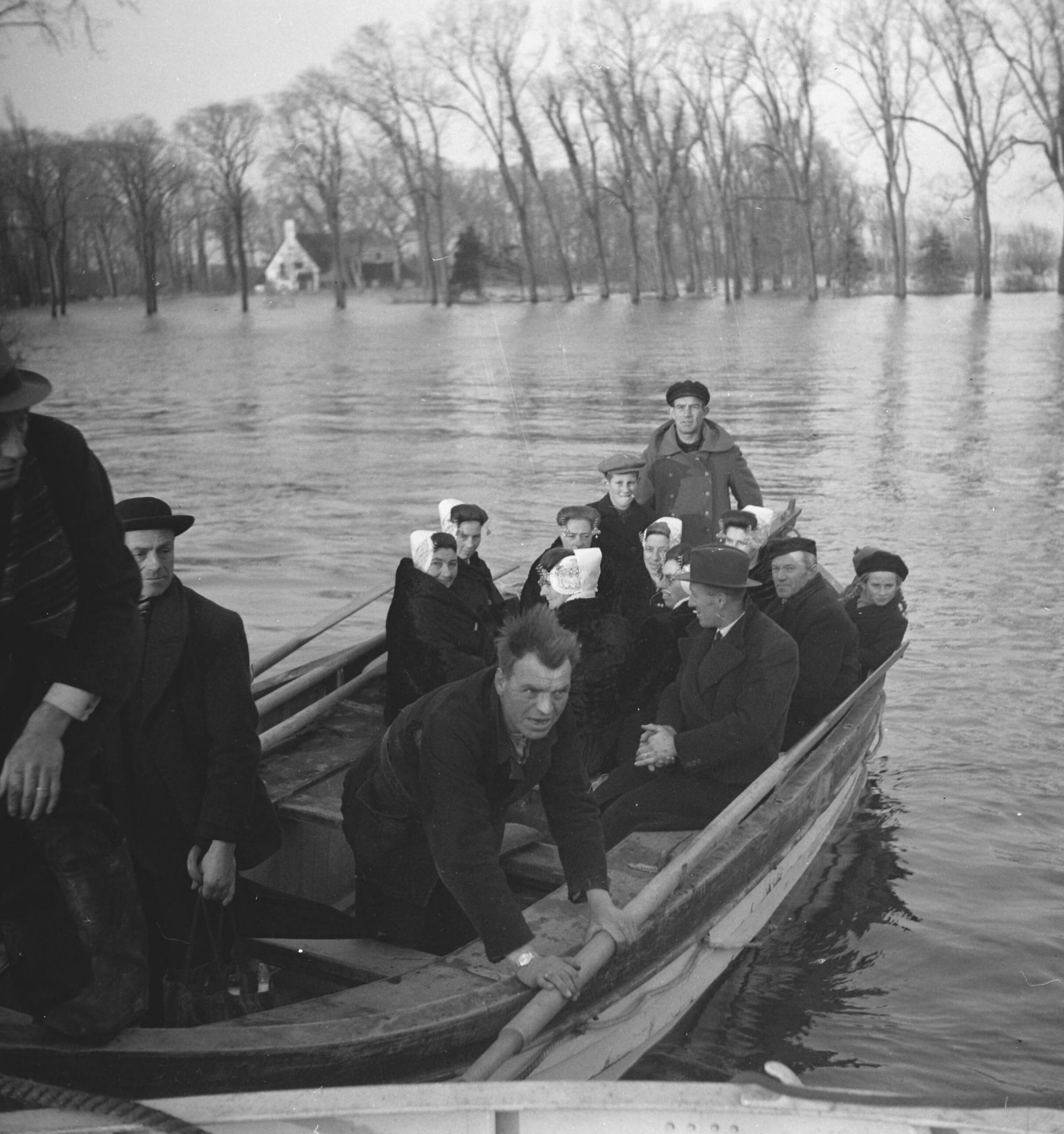 Inundaties in Zeeland Vluchtelingen in Zeeuwse klederdracht in een boot