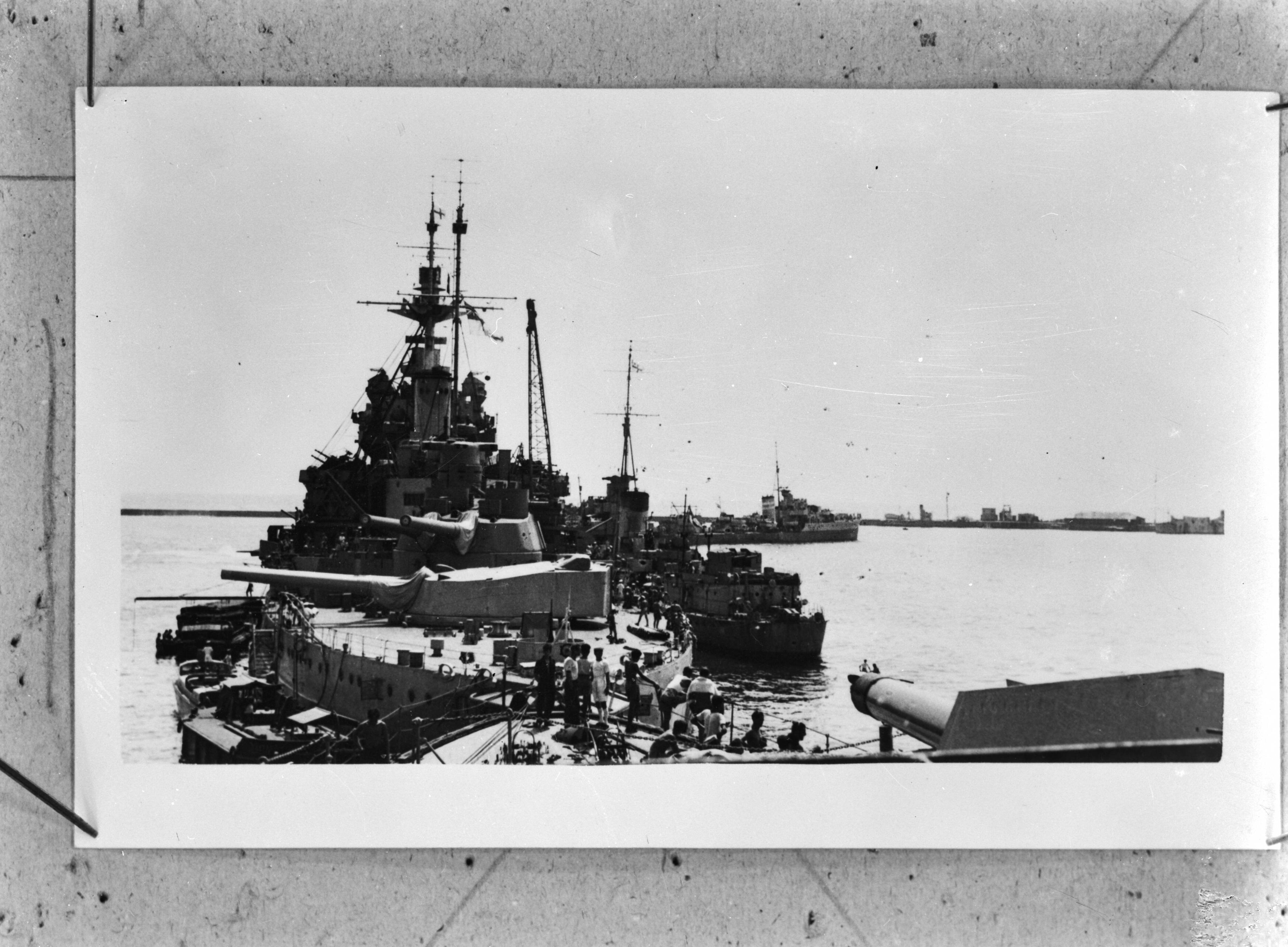 Oorlogsschepen in Sumatra. Op de voorgrond HMS "Warspite". Op de achtergrond Hr. Ms. "Van Galen"