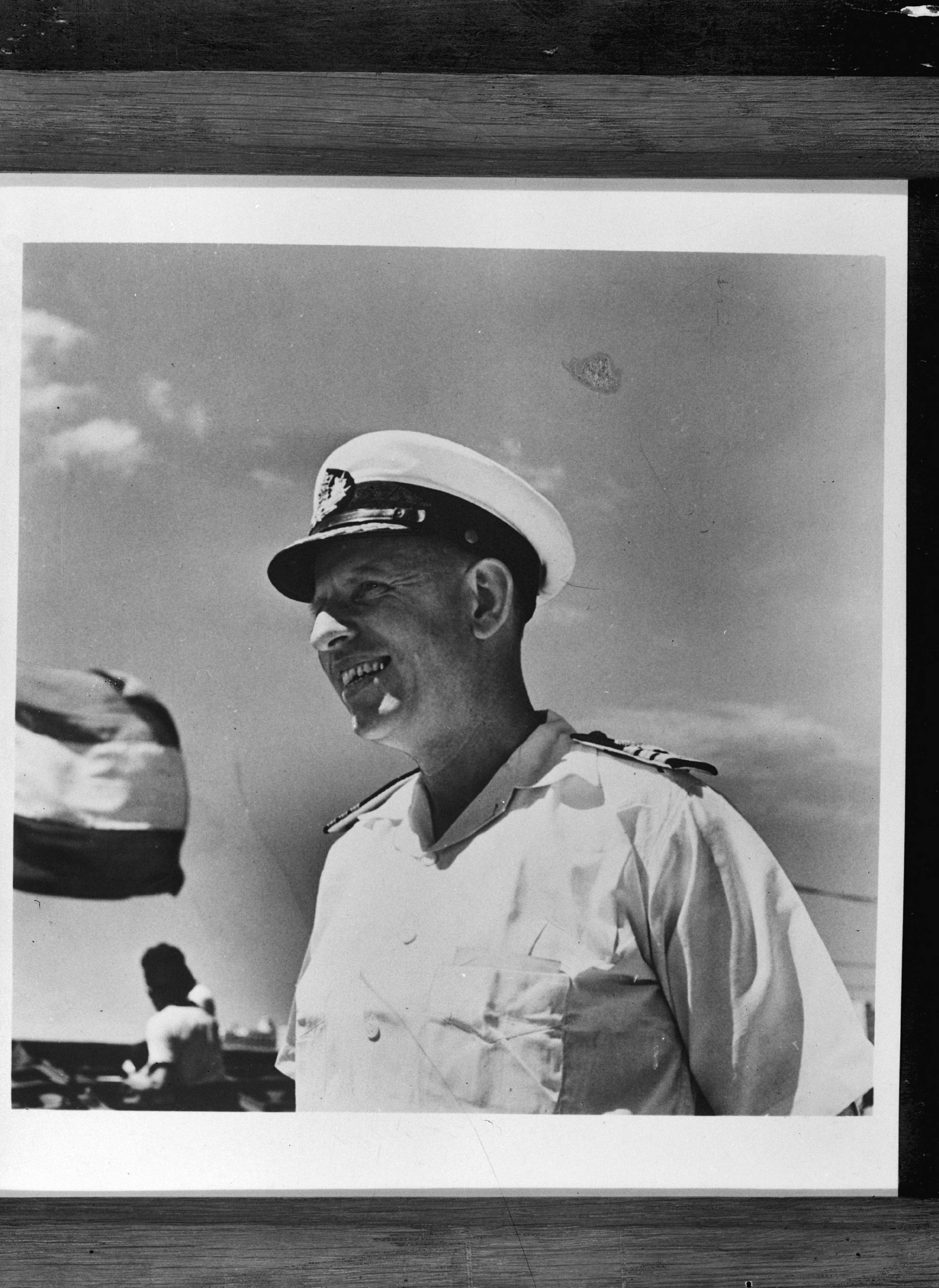 Hr. Ms. mijnenlegger "Jan van Brakel" in Amerikaanse haven. Nederlandse marine-officier