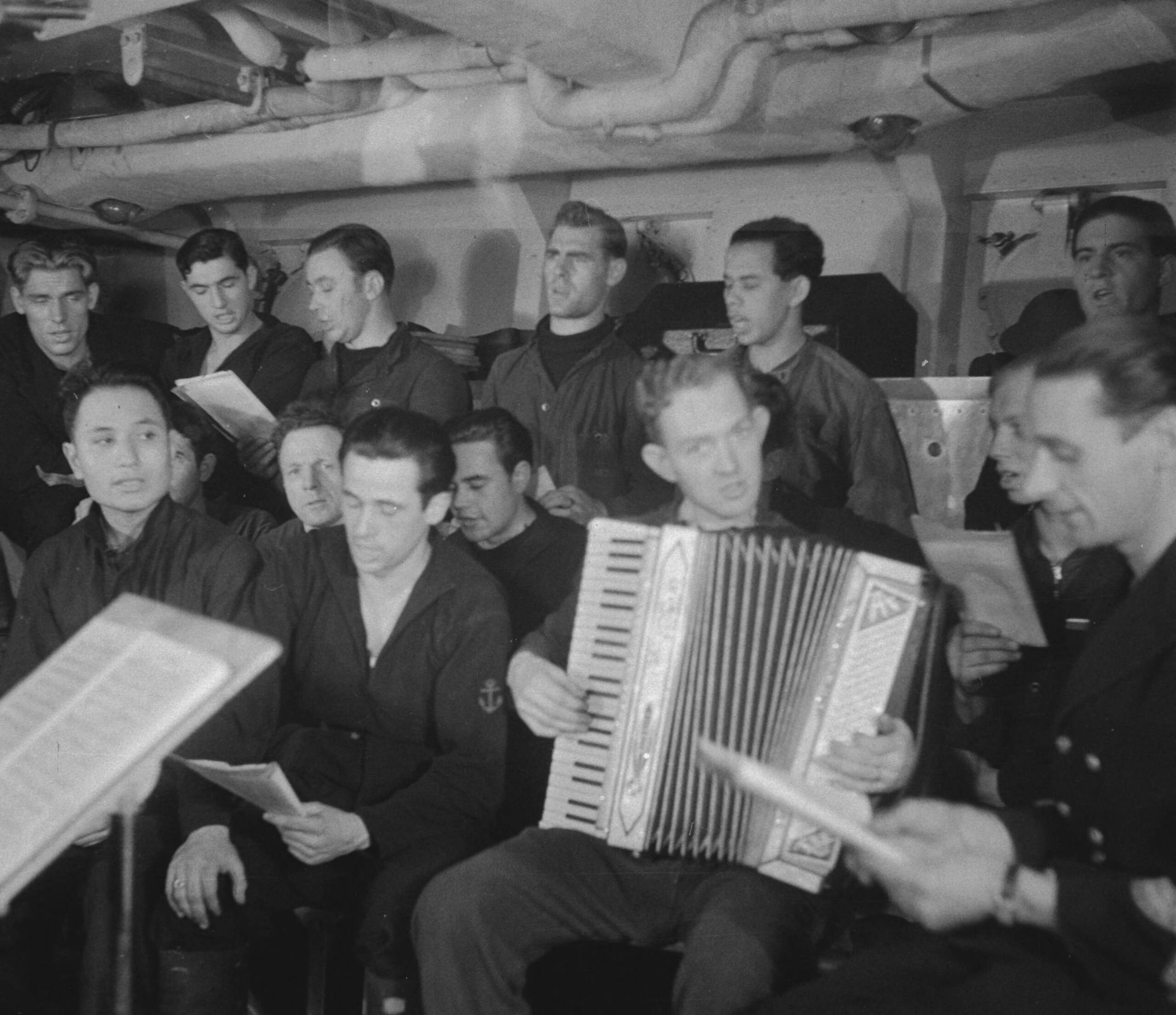 Lichte kruiser Hr. Ms. "Jacob van Heemskerck" . Bemanningsleden maken muziek