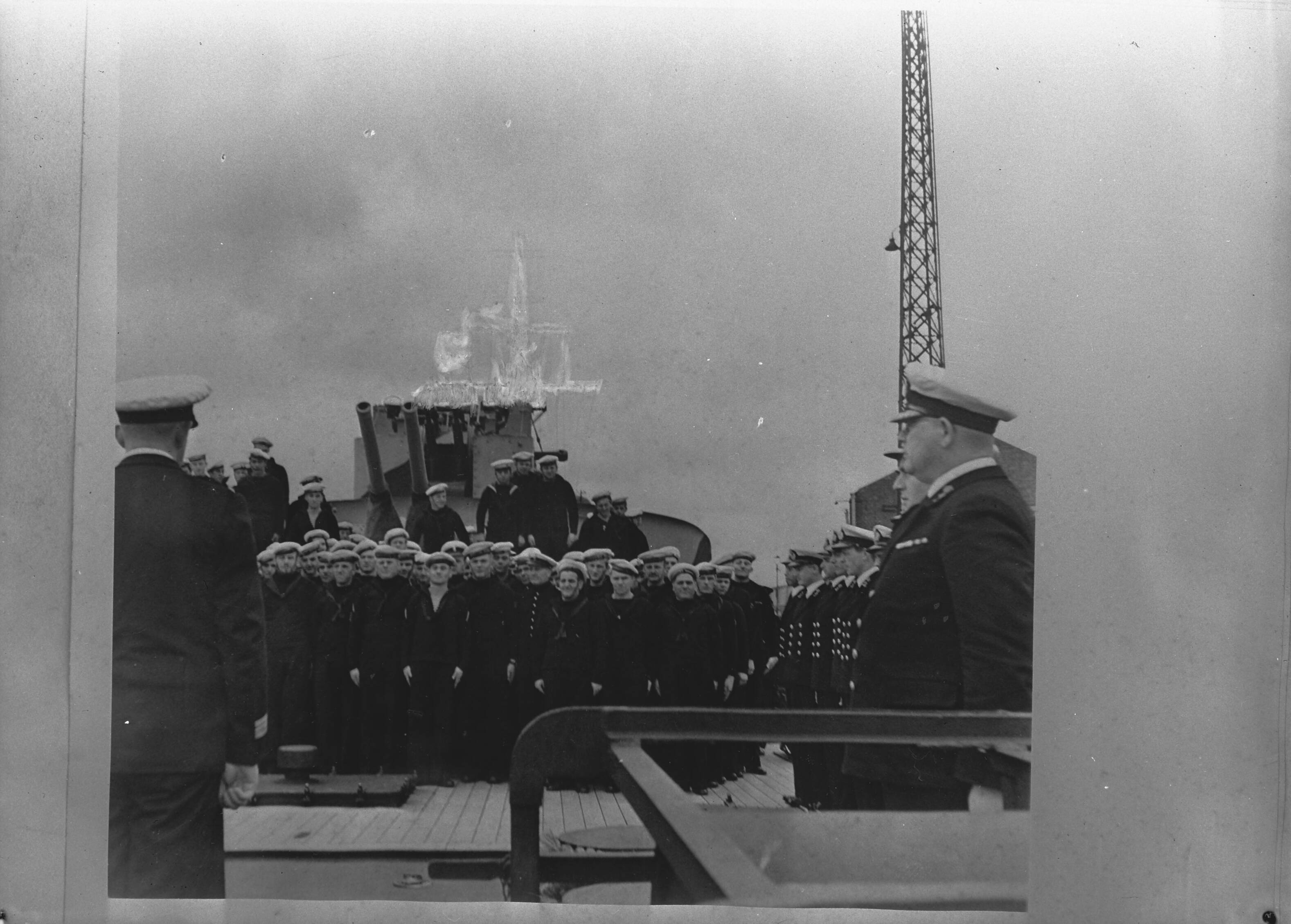 Hr. Ms. "Jacob van Heemskerck" terug in Groot-Brittannië na operaties in het Verre Oosten en de Middellandse Zee. Schout-bij-nacht Termijtelen spreekt de bemanning toe