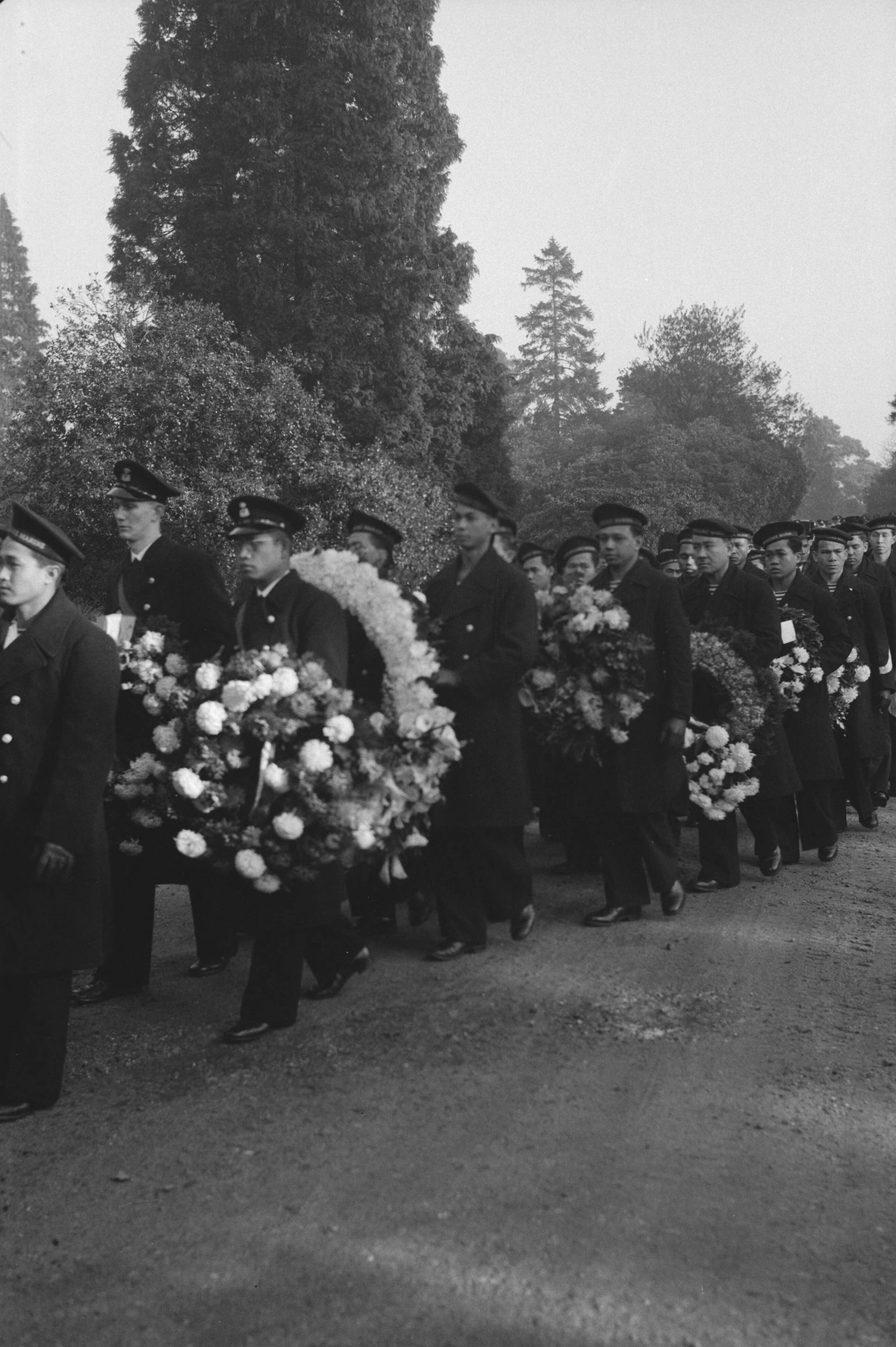 Begrafenis van minister Soejono op de Islamitische begraafplaats te Woking (Surrey). Indonesische matrozen in processie met kransen